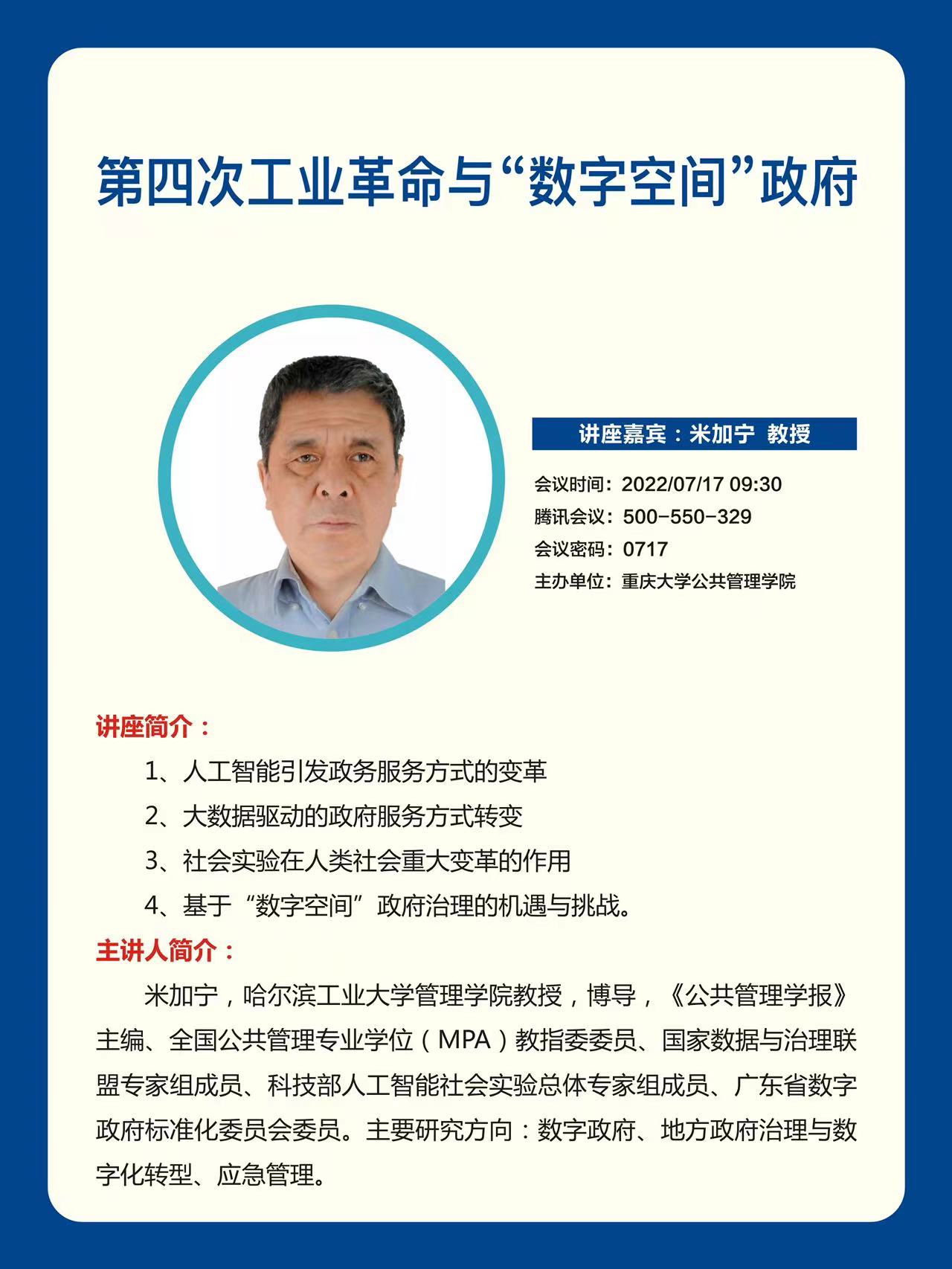 2022-09-087月17日,哈尔滨工业大学管理学院教授,博士生导师,全国公共管理专业学位(MPA)教指委委员米加宁教授,应邀在线为韩国h漫 师生作题为《第四次工业革命与“数字空间政府”》讲座。韩国h漫 MPA导师和学生300余人参与本次讲座,原MPA中心主任冉戎教授主持讲座。首先,米加宁介绍了广东省数字政府变革现状。在大数据驱动下,广东省探索出了创新性的数字政府模式——“广东模式”,主要由广东省直部门、数字广东公司、省政务服务管理局三方...