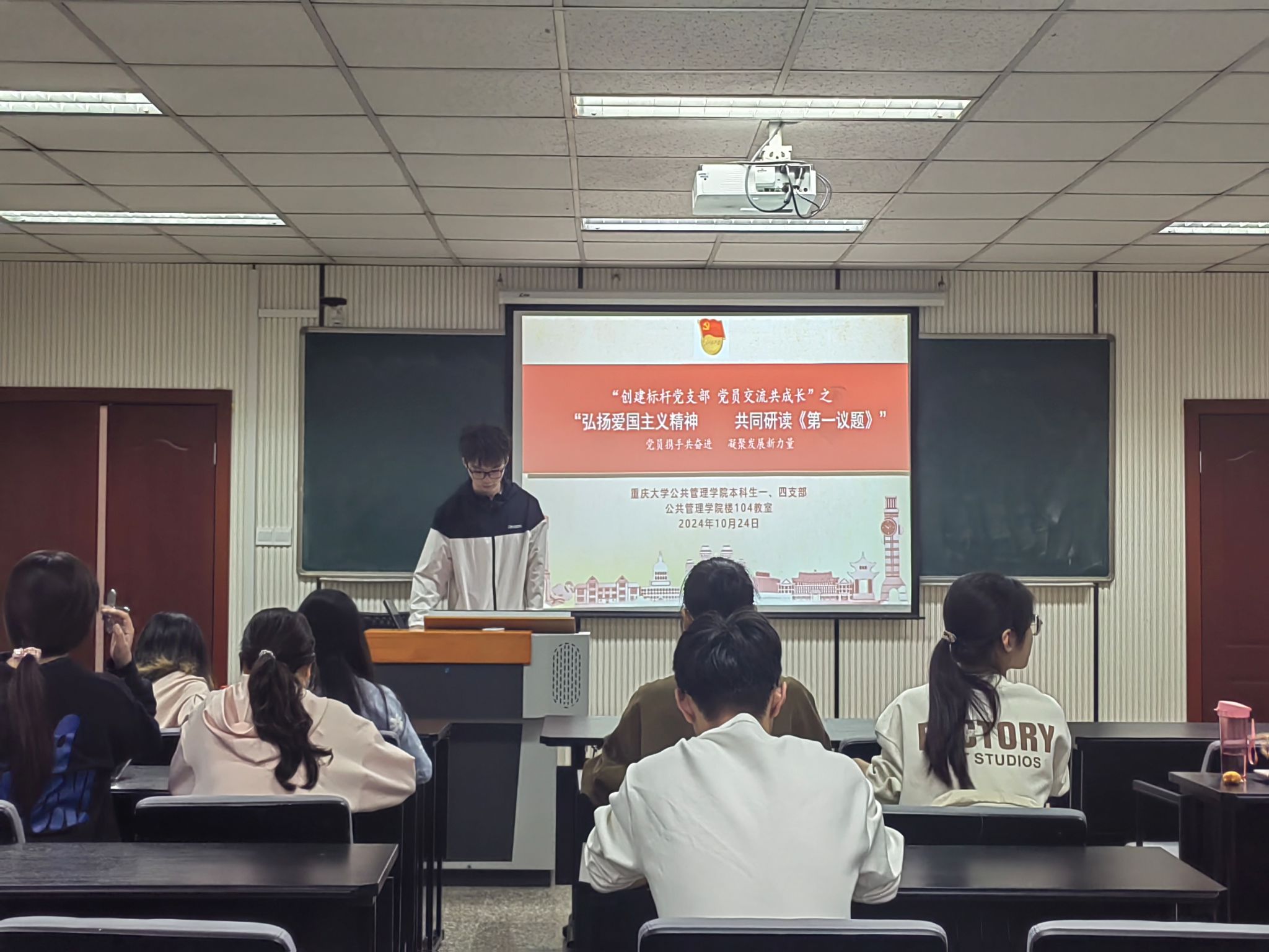 2024-10-28为了加强党的政治建设,提高党员干部的政治站位和政治能力,确保党的理论和路线方针政策得到全面贯彻和执行。2024年10月24日下午15:00,韩国h漫 本科生一、四支部全体党员、预备党员于学院楼104教室开展“创建标杆党支部——党员交流共成长”之“弘扬爱国主义精神、共同研读《第一议题》”主题活动。本次活动由朱雨同志进行主持。他从聆听习近平总书记教诲、具体要求、我们在行动三个方面带领大家进行了《第一议题...