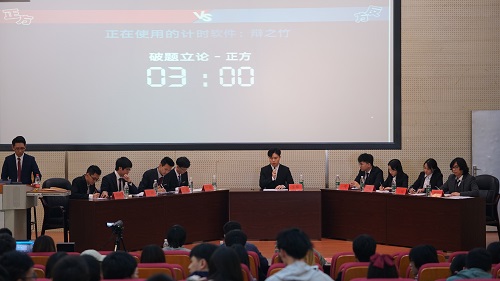 比赛进入破题立论环节,正方将正义定义为一种“朴素的社会共识”,从“迟到的正义可以起到拨乱反正的效果”和“推迟正义的到来可以降低判断失误的可能性”等几个方面进行论述。我方辩手白浩喆同学则首先确立了“迟到的正义”即“未及时发挥作用的正确的裁决”,并认为其违背了正义的核心属性,不利于人们对于正义的维持和追求。双方在定义及判断标准上的分歧使得随后质询环节的交锋变得更加激烈。辩手们才思敏捷,反应迅速,在短短几分钟的时间内抓住立论中值得争议的论点进行了精彩的反驳。