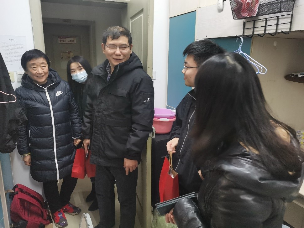 党委书记张玲老师、党委副书记袁晓浩老师、学办主任兼2019级辅导员王丽娟老师、团委书记兼2018级辅导员徐柳老师和李珊珊老师带着精心准备的考研慰问品前去慰问备考同学,向同学们传达学院的慰问和殷切期盼。