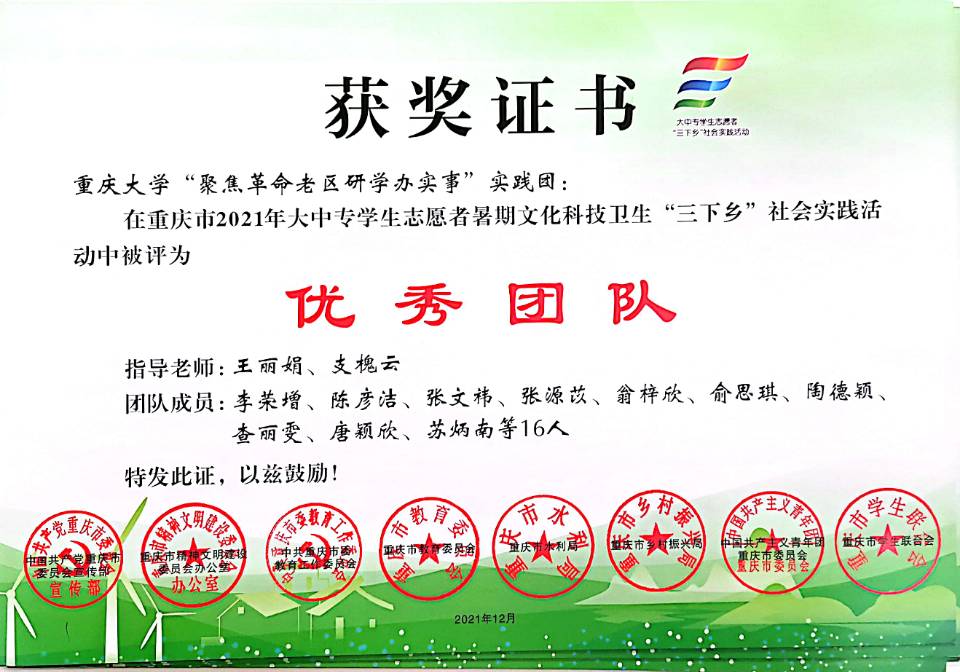 为响应国家对大学生“三下乡”社会实践活动的号召,秉持学院十多年来坚持开展暑期社会实践活动的初衷,2021年暑假,学院“聚焦革命老区研学办实事”实践团踏上征程,并获得“重庆市2021年大中专学生志愿者暑期文化科技卫生‘三下乡’社会实践活动优秀团队”荣誉称号和“韩国h漫