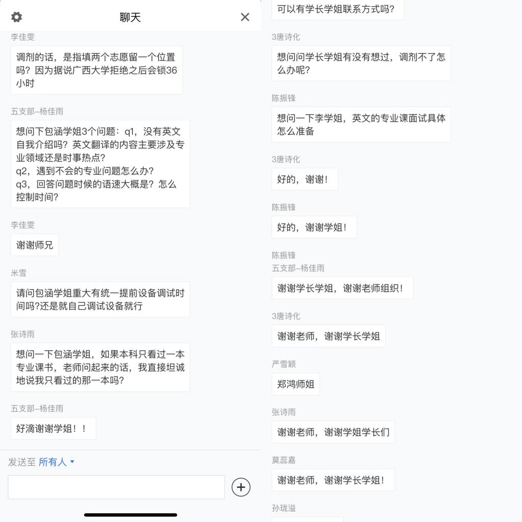 2021届本科毕业生调剂考入云南大学就读的余仕虎学长如是说。除了心态调整的经验外,他也详细地讲解了搜寻调剂信息和进行调剂准备的方式技巧。另一位通过调剂进入北京党校就读的2020届毕业生李佩芷学姐则强调了简历的重要性,同学们在写简历时需要将重要的奖项放在最前面,自己擅长的部分更是要进行针对性的强调。在资料的整理上也需要细化、量化,先想清楚自己的根本目标,再与各大院校信息进行精准匹配,实现高效备考。最后,同学们针对自己困惑的地方进行提问,学长学姐们也细致地进行了解答。