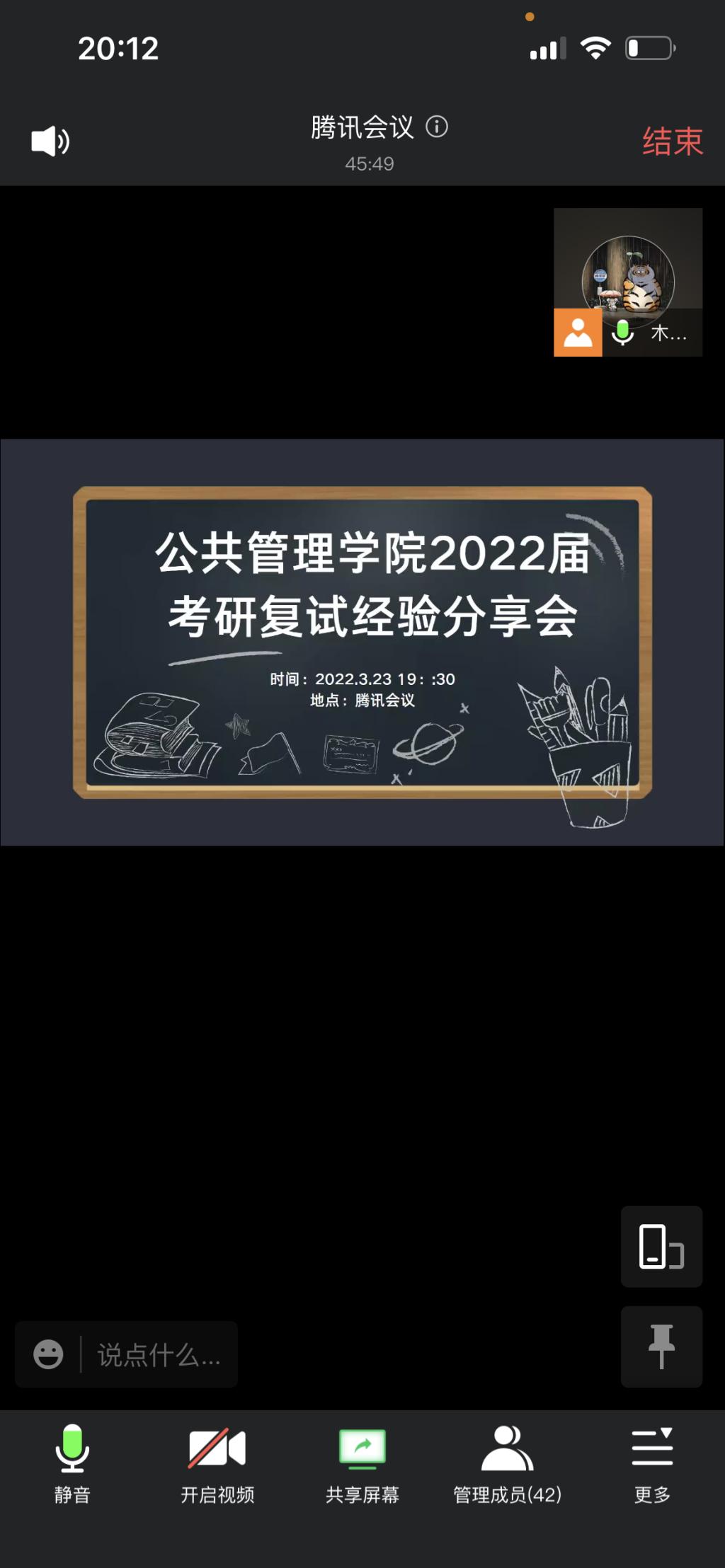 时维三月下旬,全国各院校考研初试分数线陆续公布,复试即将进行。为了帮助学院2022届本科考研学子们更好地准备研究生入学复试,学院邀请了五位2021届和2020届考研成功、有着丰富复试经验的学长学姐为同学们们进行考研复试经验分享,会议于2022年3月23日晚19:30以线上会议方式举行,由韩国h漫