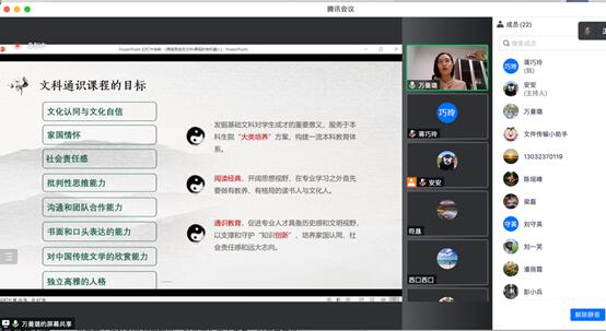 课程思政建设,提高教师育人的思想自觉和综合能力,学院2022年4月22日 上午10点邀请了重庆市课程思政教学名师万曼璐老师为全院教职工开展了线上课程思政培训专题讲座——“文明传承,你我之责——课程思政在文科课程的有机融入”。学院全体教师通过线上腾讯会议的方式参与了讲座学习。