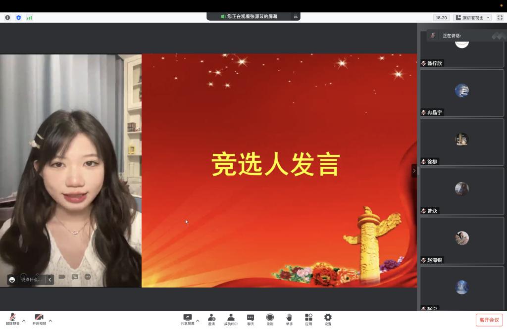 团委学生会对本科生2021级纳新竞选会议如期于线上举行。学办主任兼19级辅导员王丽娟、团委书记兼21级辅导员徐柳、20级辅导员包唅、20级团委学生会主席团成员以及21级参与本次竞选的同学参加会议。