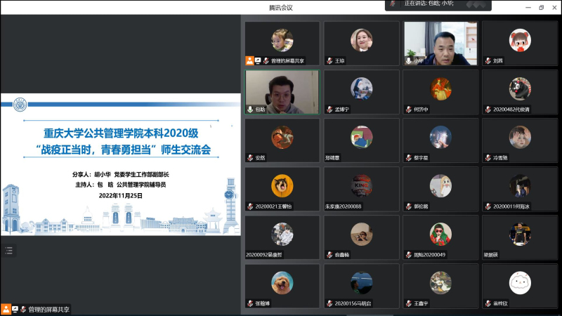 本科2020级“战疫正当时,青春勇担当”师生交流会通过腾讯会议线上举行。党委学生工作部副部长胡小华受邀参加并作分享,学院2020级全体本科生参加,2020级辅导员包晗主持。