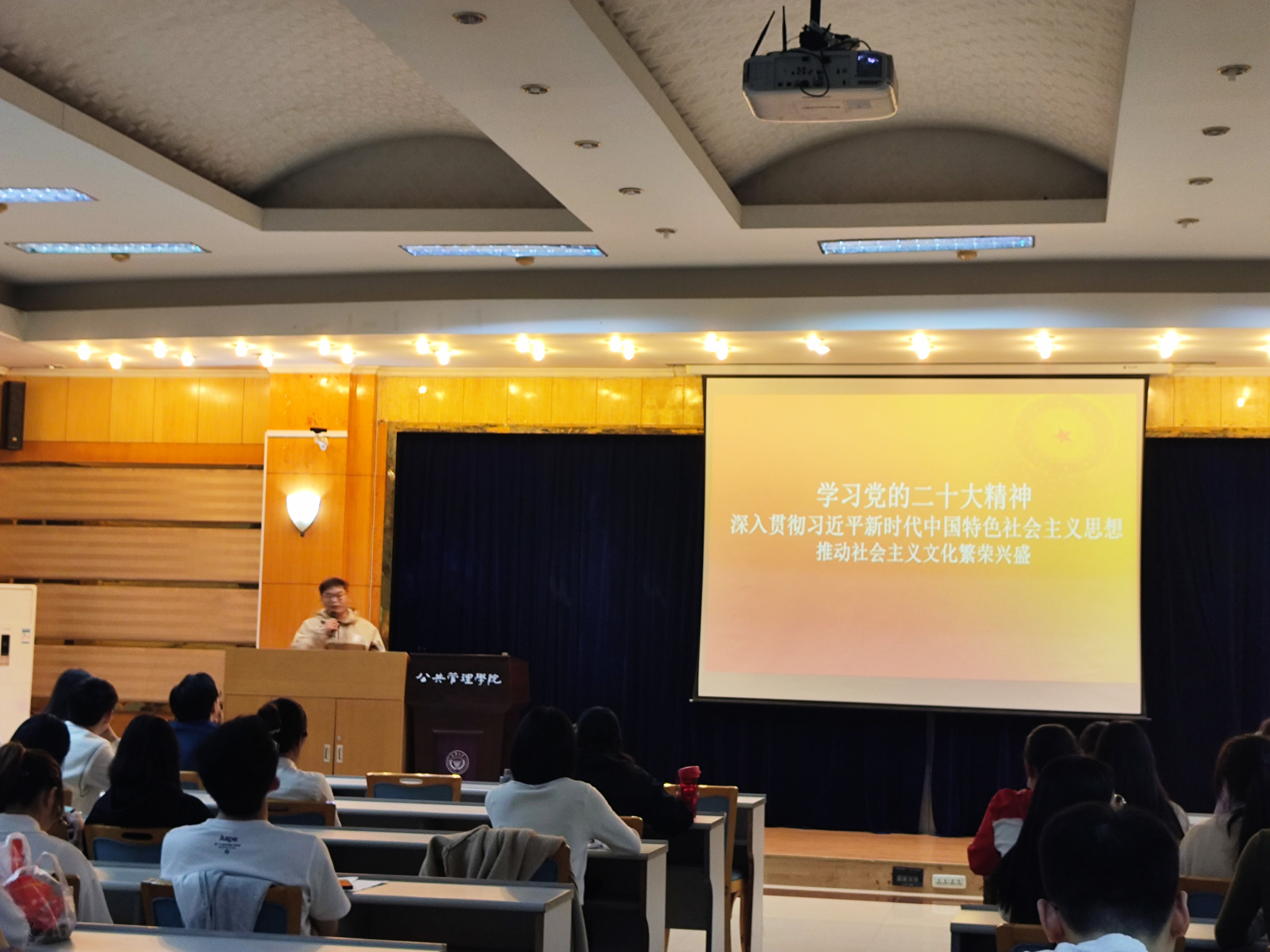 2023级研究生何枘霖简要介绍了党的二十大精神,抓住关键词“文化自信自强”,带领同学们回顾了习近平总书记关于文化自信的重要论述,从文化自信的守正创新以及文化自信的青年使命两方面进行理论宣讲。随后通过知识竞答、猜歌名等互动,带领同学们回顾日常生活背后的中华文化。