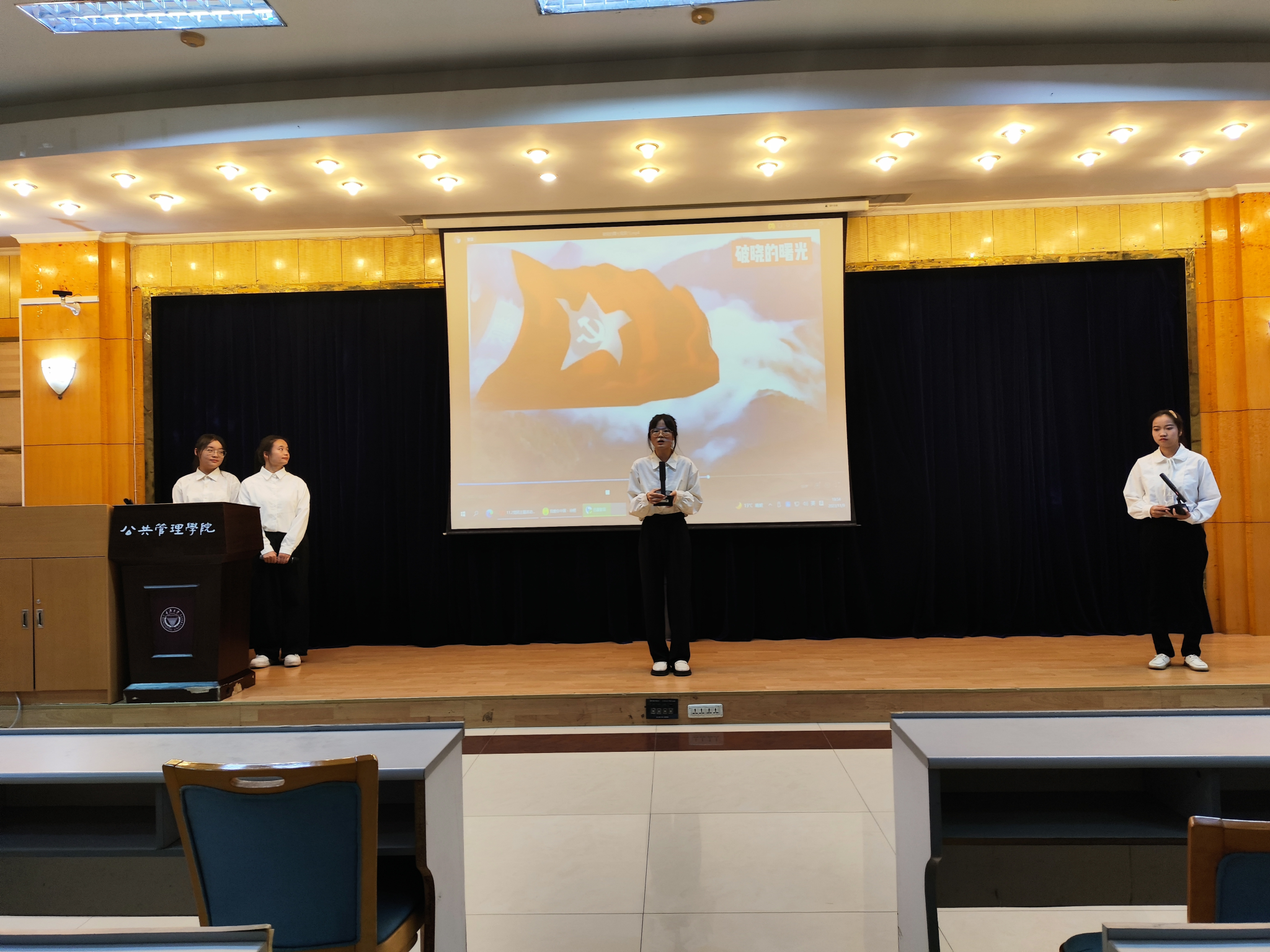 在“以蓬勃青春之声,讲家乡红色故事”环节,同学们以演讲、朗诵等不同形式回溯家乡红色记忆,讲解家乡红色故事。《缅怀先烈:共产党人是不可动摇的——许晓轩》《矢志践行初心使命,创造辉煌开辟未来》和《破晓的曙光》三个作品用声音道出响亮的爱党爱国情怀,引起了在场同学的强烈共鸣,体现出公管学子鲜明的时代精神和现实关怀。