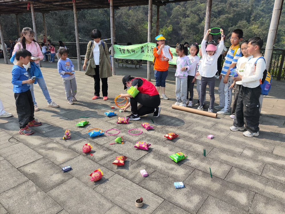 二组是环保宣传小分队,5名志愿者在山底摆点,通过垃圾瓶置换套圈、利用废弃瓶种植多肉等游戏方式,鼓励游客关注景区卫生环境。活动结束后,学生志愿者积极交流,总结活动经验。