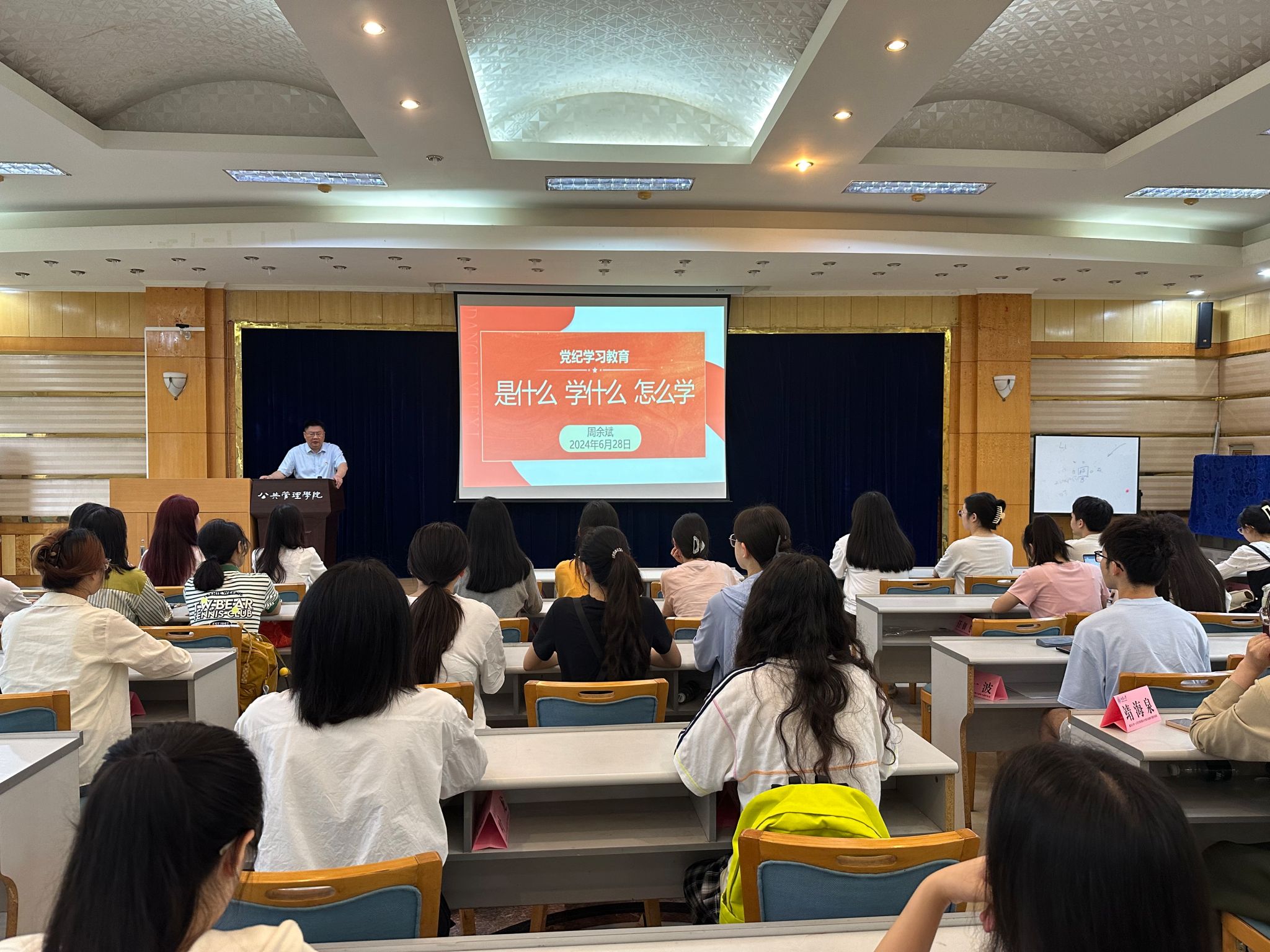 学院党委副书记、纪委书记周余斌讲授题为《党纪学习教育是什么 学什么 怎么学》专题党课。周余斌指出,此次党纪学习教育,是加强党的纪律建设、推动全面从严治党向纵深发展的重要举措。他要求同学们要深入学习领会习近平总书记关于全面加强党的纪律建设的重要论述,要把党纪学习教育融入日常、抓在经常,自觉学纪,准确知纪,对标明纪,严格守纪,做到知行知止、令行禁止,时刻把纪律挺在前面。
