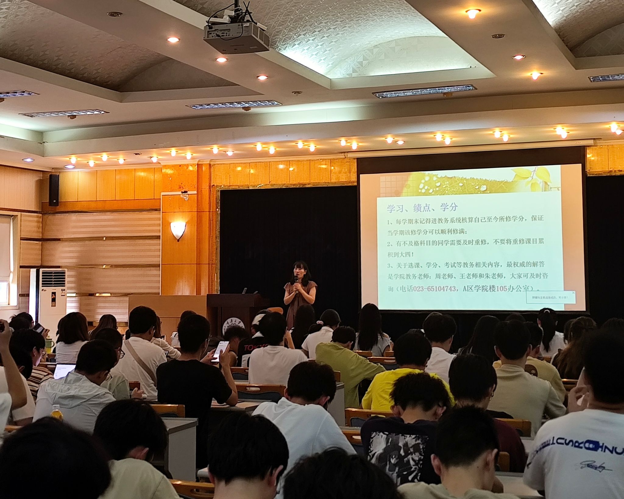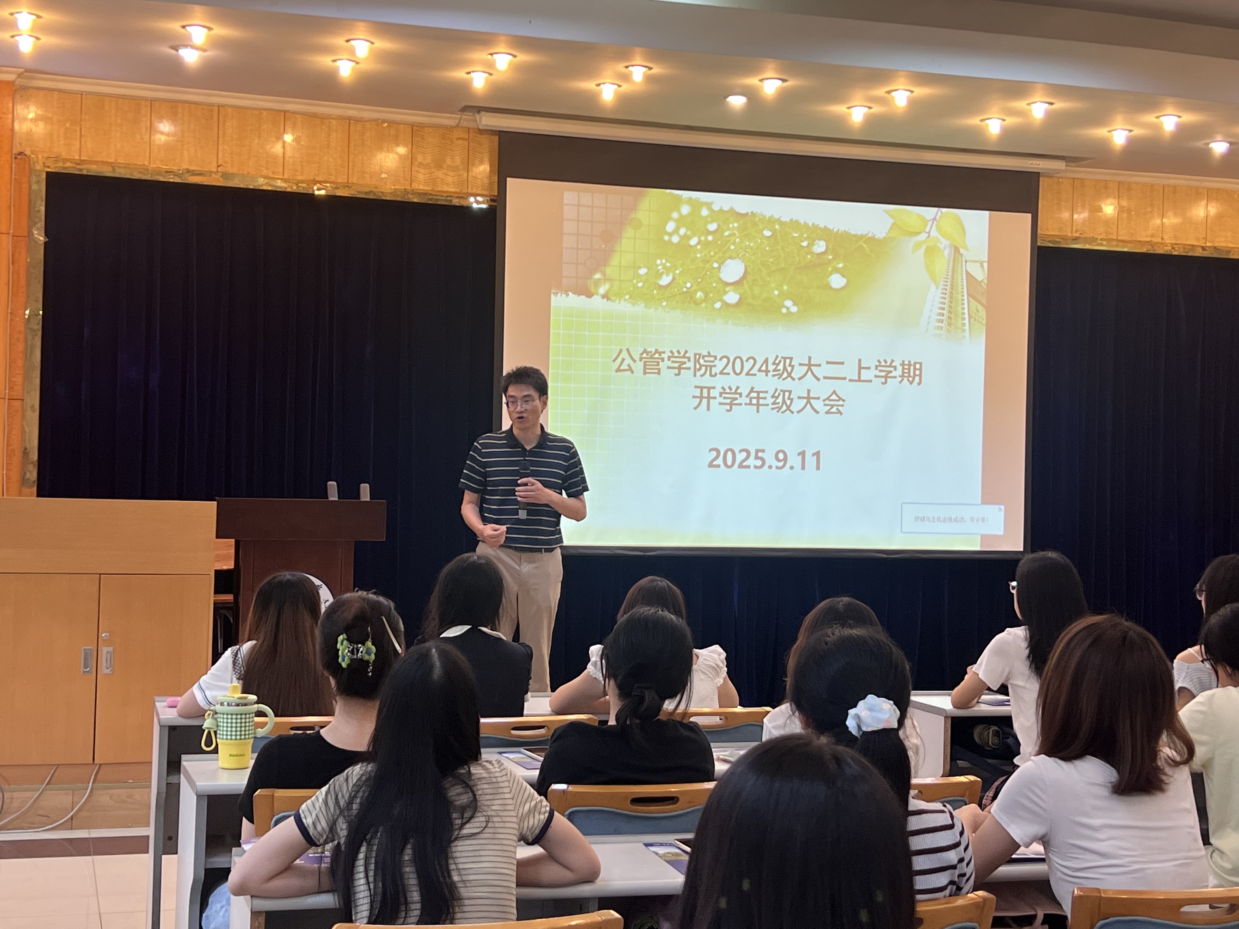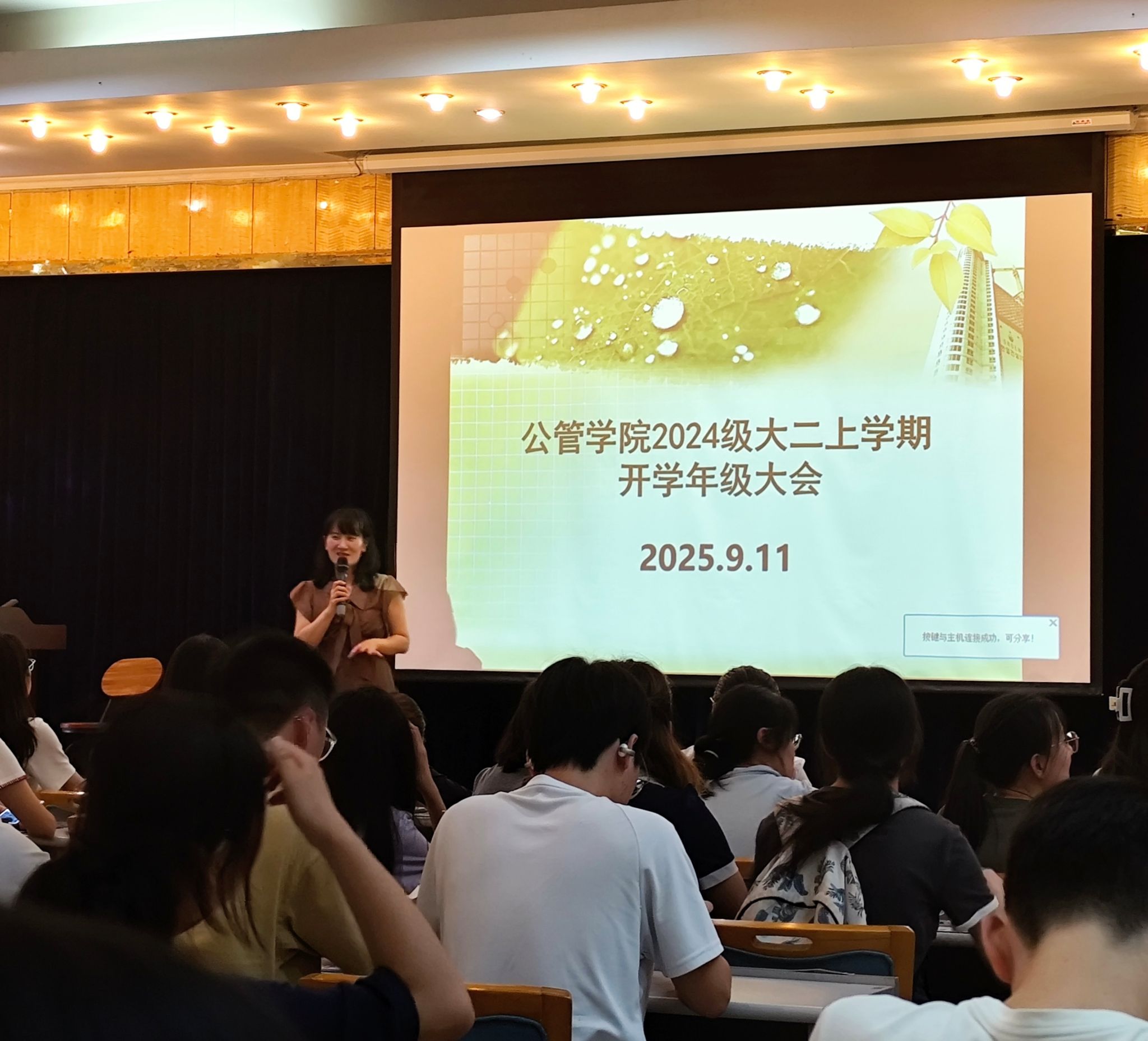 在学院202报告厅召开了2024级本科生2025-2026学年第一学期开学年级大会暨生涯规划指导大会。学院党委副书记、纪委书记周余斌,副院长丁从明出席会议。会议由2024级辅导员、学院团委书记徐柳主持,全体2024级本科生到场参加。