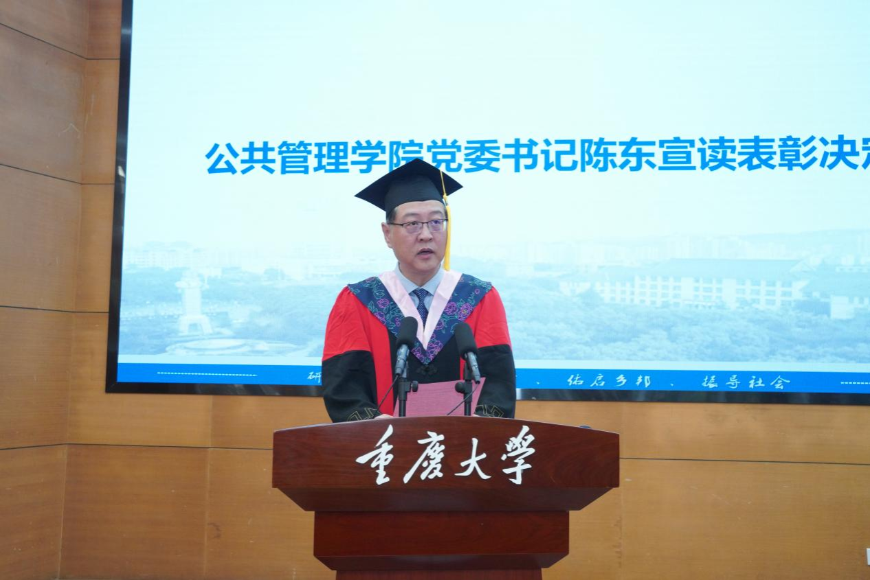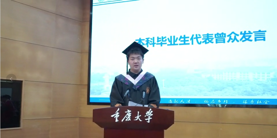 专业学位硕士毕业生代表叶霖发言,他回望了在重大的三年时光,由衷地感恩母校、学院和各位老师,即将带着母校赋予的智慧与力量奔赴四方,以重大人“研究学术,造就人才”的使命为指引,在各自的工作岗位上发光发热,为推动公共管理事业的发展贡献自己的一份力量。