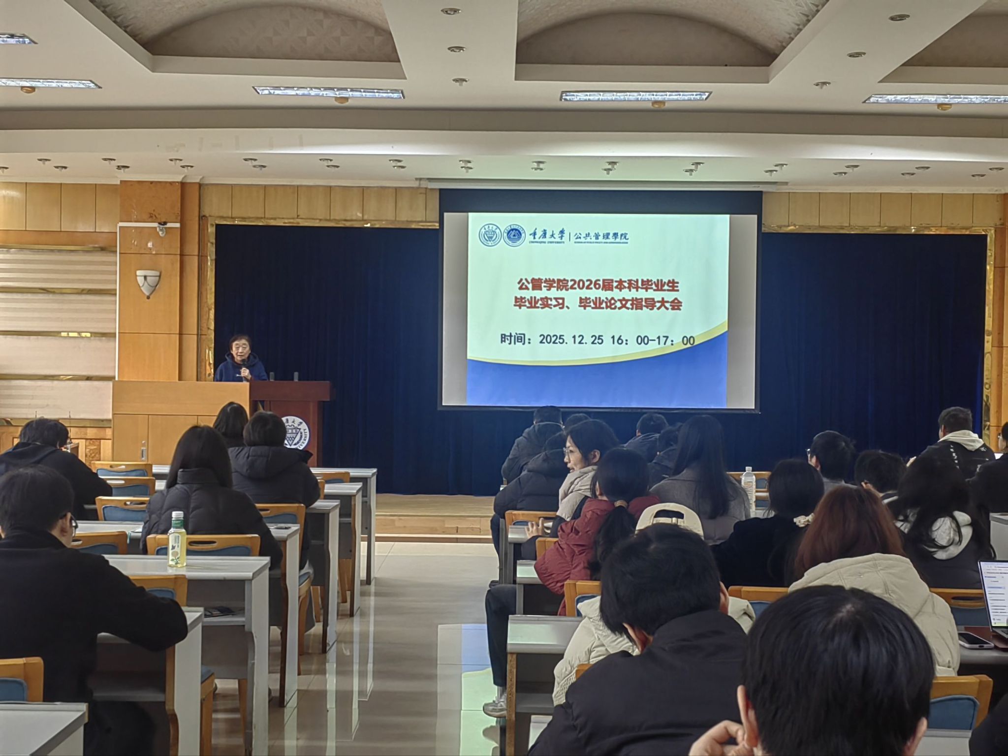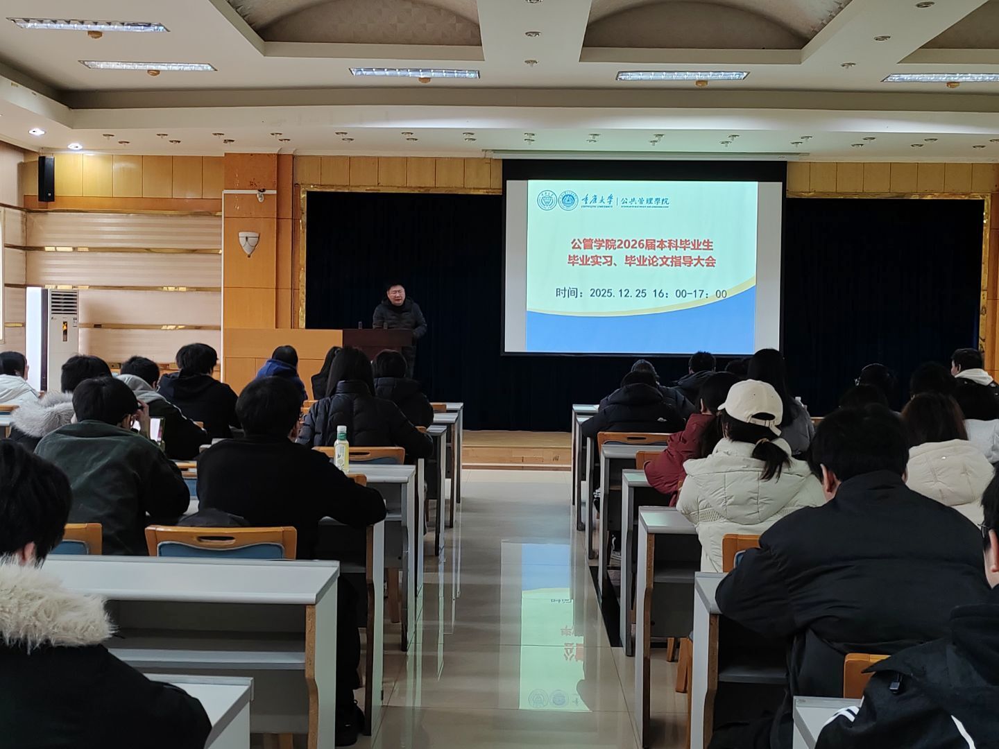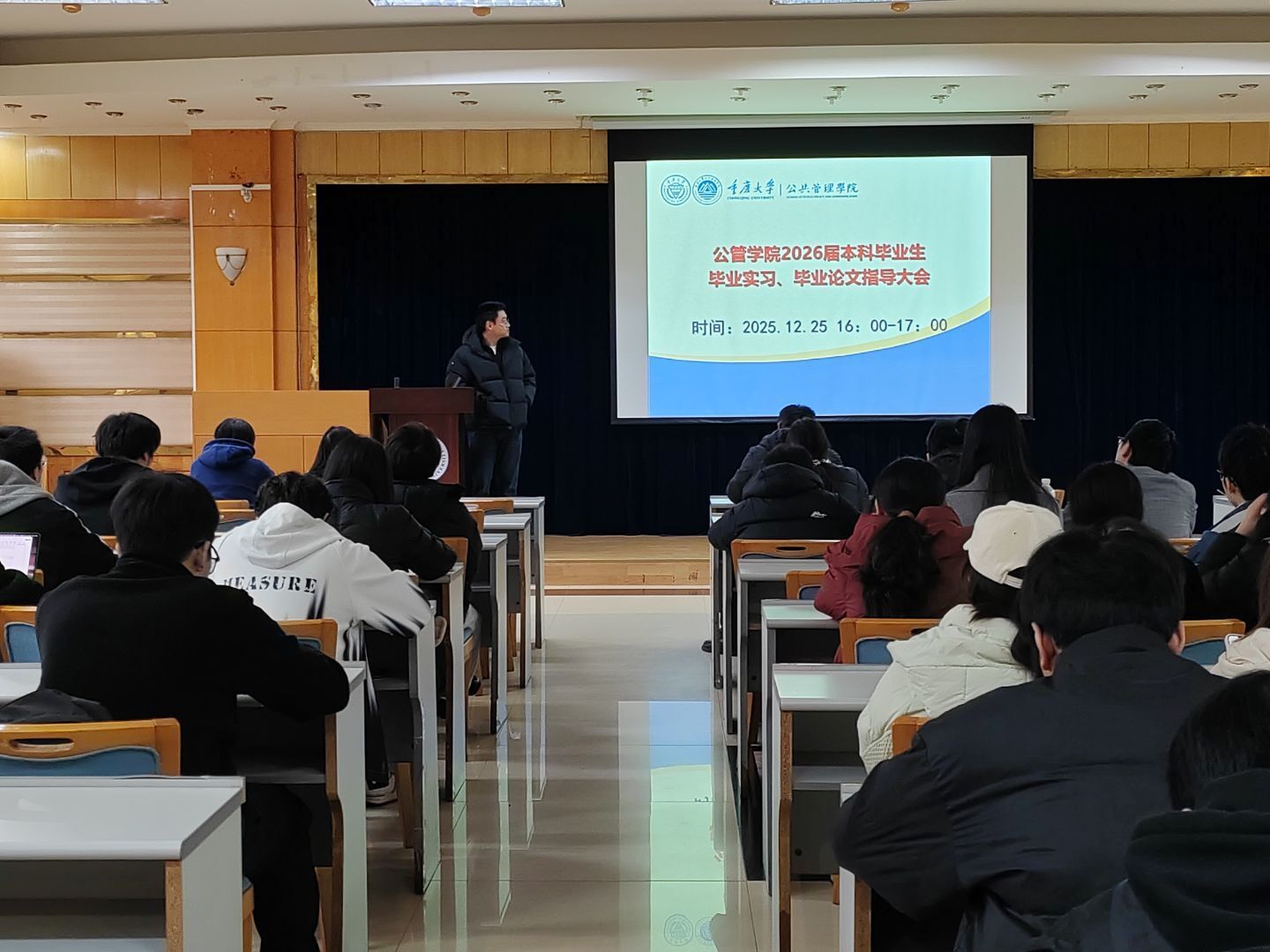 为精准赋能2026届本科毕业生稳步推进毕业论文撰写、圆满完成毕业实习任务,20251225日下午16:00,学院在102报告厅隆重召开专题指导大会。学院党委副书记、纪委书记周余斌,副院长丁从明莅临会议指导,会议由2026届本科毕业生辅导员王丽娟主持,全体毕业生齐聚现场参会。