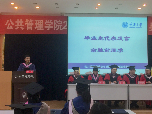 随后,余胜前同学作为毕业生代表发言。他深情回顾了几年的学习历程,感慨光阴似箭与在学院里用时光积满的充实。他朗诵了自己为毕业所填的词《水调歌头·硕士毕业有感》,向谆谆教诲的老师们、一起学习的同学们表达了感恩与感谢之情,并表达将与大家一同勉励,继续学习努力工作,抒写人生的华章。
