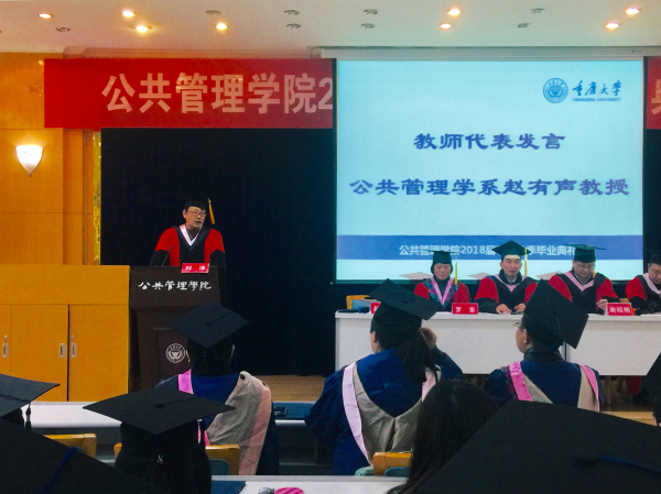 教师代表、公共管理学系赵有声教授发言。作为改革开放后第一批入学大学生的赵有声教授向圆满毕业、获得学位的同学表达了热烈的祝贺。赵教授谈起今天是毛主席的诞辰与今年是改革开放四十周年这两个不平凡的时间点,并以一个学者与教育工作者的身份回顾了四十年教育发展与公共管理学科发展的历程,梳理了学院公管学科的研究史与建设史。他表达了MPA学生将专业知识学习与公管工作实务结合的不易,并祝福同学们鹏程万里。