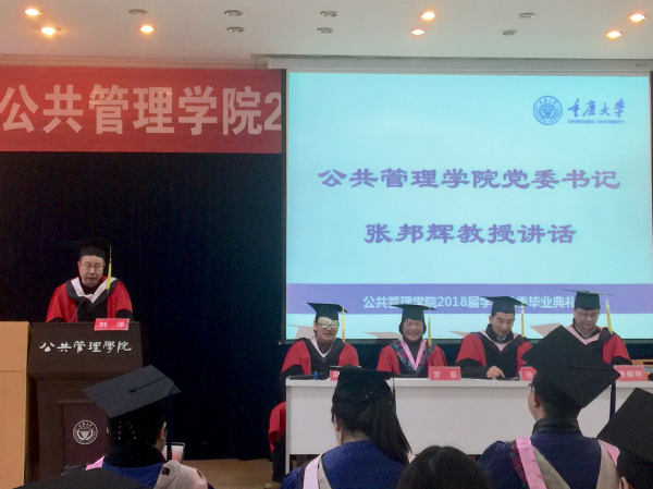 张邦辉在他的讲话中,代表学院向毕业同学们表达衷心的祝贺,向辛勤付出的老师与员工表示感谢,也向同学们的家长与家属致以诚挚的祝福。他从“感恩”出发,叮嘱同学们要注重感恩家人与身边的人,学院培养首先注重的就是学生的品质素养与道德情操;他从“回忆”谈起,说到了学院近年来获批重庆市首个公共管理一级学科博士授权点等一系列发展与进步,对同学们的共同努力表达了感激;他以“畅想”抒怀,嘱托同学们学无止境,无论身处任何岗位和环境,都要心怀国家社会、肩负责任,铭记“重大精神”,记得自己是“重大人”。祝福同学们工作顺利、前程似锦。