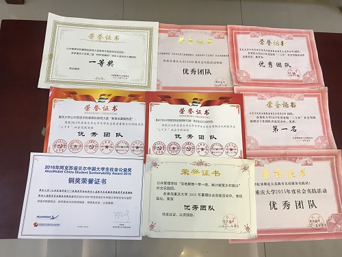 不仅如此,让老师们更加欣慰的是,同学们还会利用暑期实践的机遇,联系自身专业所学,将知识与实际生活相结合。2011年,实践团在贵州西江苗寨进行支教调研的同时,还立项参加“挑战杯”全国大学生课外学术科技作品竞赛,该团队的《旅游业发展背景下民族社区环境保护的组织机制创新》一文在作为团队指导老师的罗章教授指导下,获得了第十二届“挑战杯”西安世园会专项赛全国特等奖;2015年暑期团中央赴陕西大荔教育关爱服务团在2016“阿克苏诺贝尔中国大学生社会公益奖”获铜奖;2017年赴“安徽歙县教育关爱服务团”由马铭阳、张金梦、寇桂涛撰写《党员有党性,千亩种荒山》成功收录到《“千校千项”》,2018暑期“实地聚焦一带一路,献计献策乡村振兴”为主题的实践活动,入围团中央“丝路新世界·青春中国梦”全国专项以及重庆市暑期“三下乡”重点项目、韩国h漫