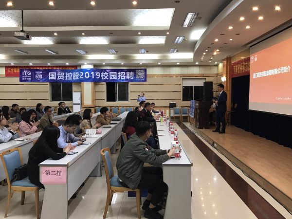 当晚7点,厦门国贸控股集团有限公司在学院二楼多功能厅举行面向全校学生的校园专场招聘会,参与学生近百人,现场互动频繁、气氛热烈。