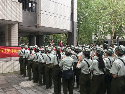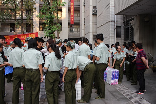 在学院党政领导的关心和指导下,2018年9月21日中午12点30分,学院党委副书记刘淳、学办主任兼17级、18级导员王丽娟老师一同来到松园四栋女生宿舍楼下为刚刚走进大学校园、正在进行军训的18级新生发放慰问品,并由刘淳副书记和王丽娟老师发表讲话,向同学们致以亲切问候。