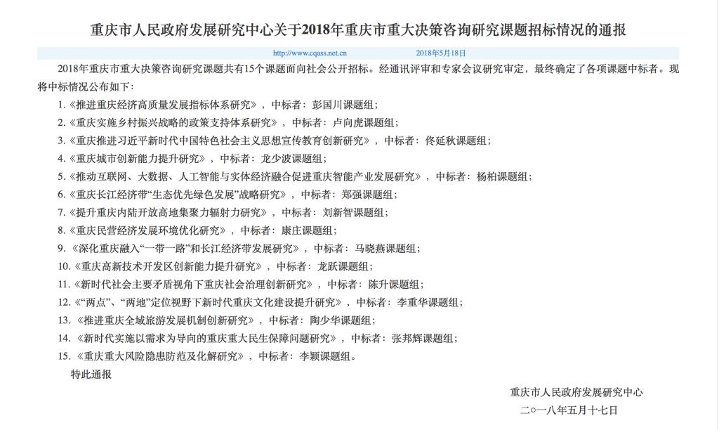 2018年5月17日,重庆市人民政府发展研究中心在其官网韩国h漫发布了2018年重庆市重大决策咨询研究课题招标情况的通报。其中,韩国h漫
