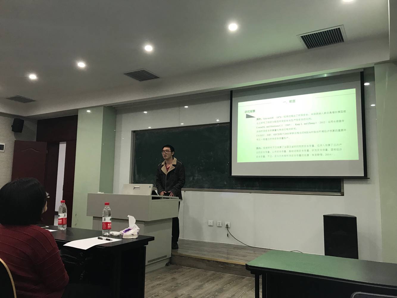 首先,郭科同学针对《退役模式、年龄效率函数与环保资本存量测算》一文为大家分享了写作过程当中对模型的选择及数据运用过程,通过数据的分析对当前中国东西部环境资本状况和环境污染处理能力进行总结。然后,李波同学从问题的提出背景、研究现状、研究理论框架、研究设计、变量说明、实证研究过程和结论七个方面为我们展示了《农民工养老安全感主观评价的影响因素研究——基于代际差异的比较分析》一文的脉络与思路。张培莹同学从问题提出、数据及研究方法、主要变量的介绍、研究假设、实证检验和结论分析六个方面介绍了她的论文《家庭重组对子女人力资本投资的实证研究——基于CHARLS的经验证据》。接下来,游望对自己的论文《基于省级投入产出模型的长江经济带产业关联分析》也进行了相关的思路及所用数据的介绍。最后三位评委老师针对四位同学论文的优点和欠缺进行了点评,分享同学对在场同学的疑问也进行了详尽的回答,相信对同学们都有所启发。