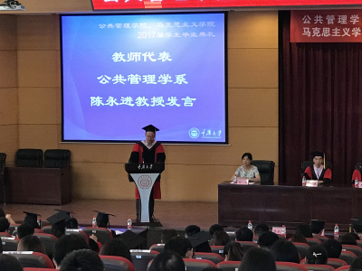 公共管理系主任陈永进教授作为教师代表发言。他说很庆幸我们大家得以相识、相知、相伴于这一段人生旅途。离别之际,老师们期待大家今后都能够选择善良与正义,追求平凡而不平庸的生活。愿你们成为“自尊、自信、自立、自强的幸福的进取者!”