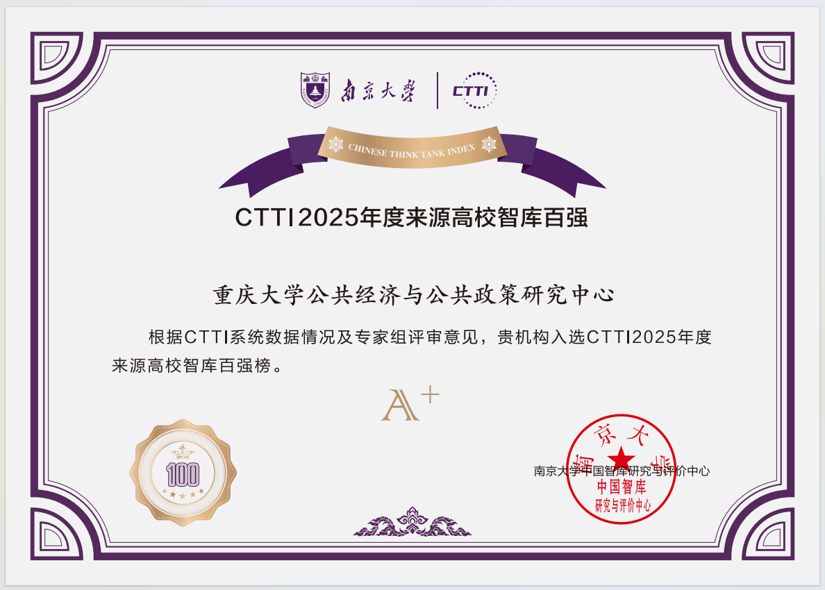 中心始终立足国家和区域发展需求,聚焦重庆市及西部地区的经济发展战略与公共政策问题,围绕城乡统筹、内陆开放、社会保障、应急管理等领域开展深入研究,积极发挥决策咨询作用,相关成果多次获得政府部门采纳和领导批示。2016年12月,中心首次入选CTTI来源智库,此次再获百强A+评级,标志着其智库建设水平与政策影响力迈上新台阶。