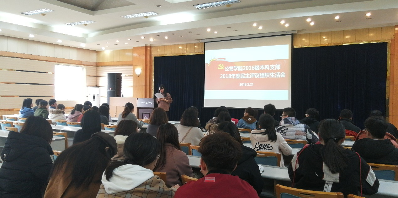 为深入学习贯彻习近平新时代中国特色社会主义思想,推进“两学一做”学习教育常态化制度化,严格执行新形势下党内政治生活若干准则,增强党内政治生活的政治性、时代性、原则性、战斗性,2016级本科支部于2019年2月21日下午4点开展民主评议党员会议,会议由支部书记徐柳老师主持。