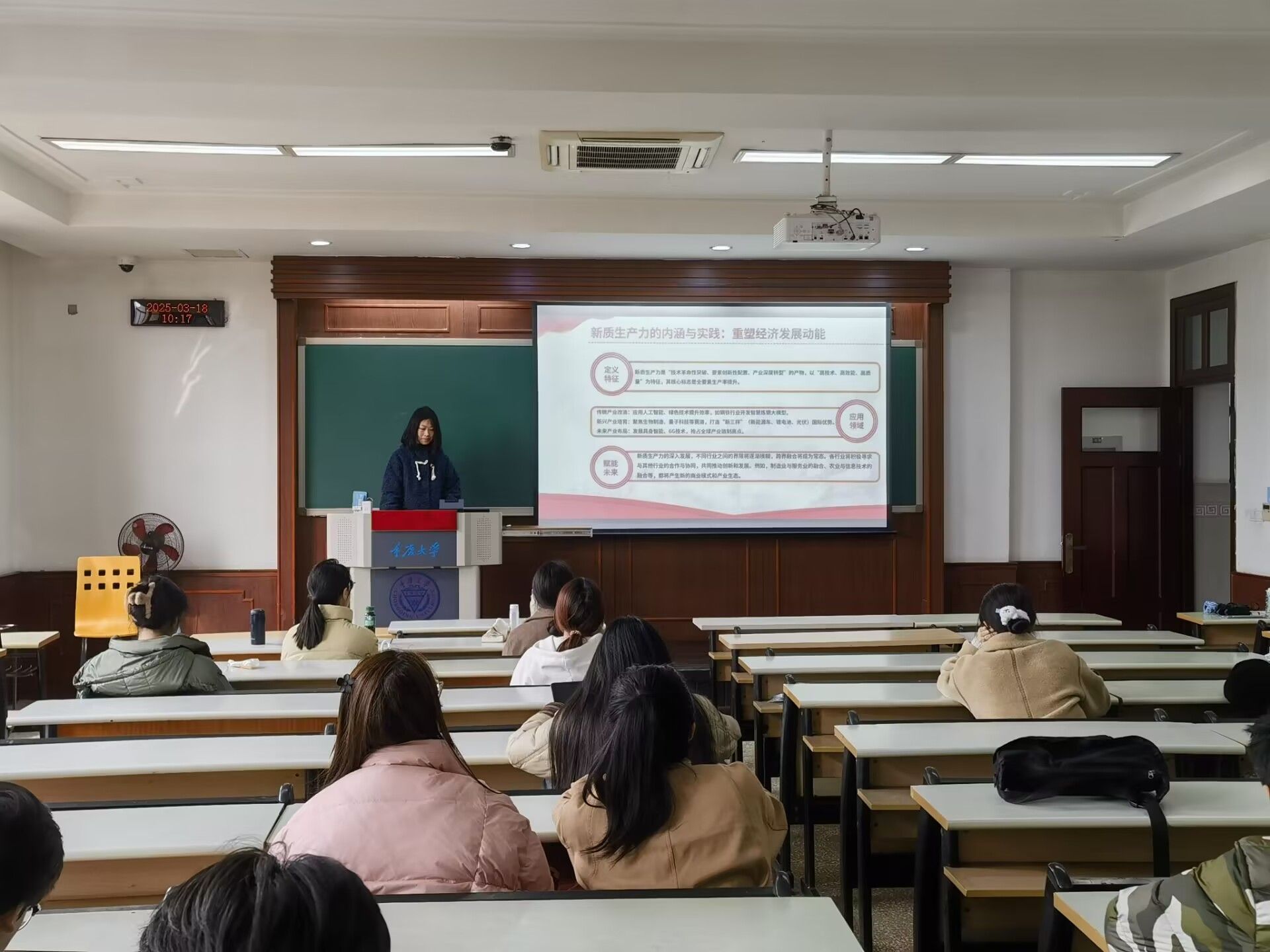 紧接着,左云湘为大家深入剖析了新质生产力的内涵,即新质生产力是“技术革命性突破、要素创新性配置、产业深度转型”的产物,以“高技术、高效能、高质量”为特征,其核心标志是全要素生产率提升。并据此强调了发展新质生产力的必要性,以及新质生产力的应用领域。正如习近平总书记所言:“未来属于青年,希望寄予青年。”同学们在聆听后深受启发,意识到唯有将青春融入时代洪流,方能以“青春嘉木”滋养“数智沃土”,共赴民族复兴的光辉未来。