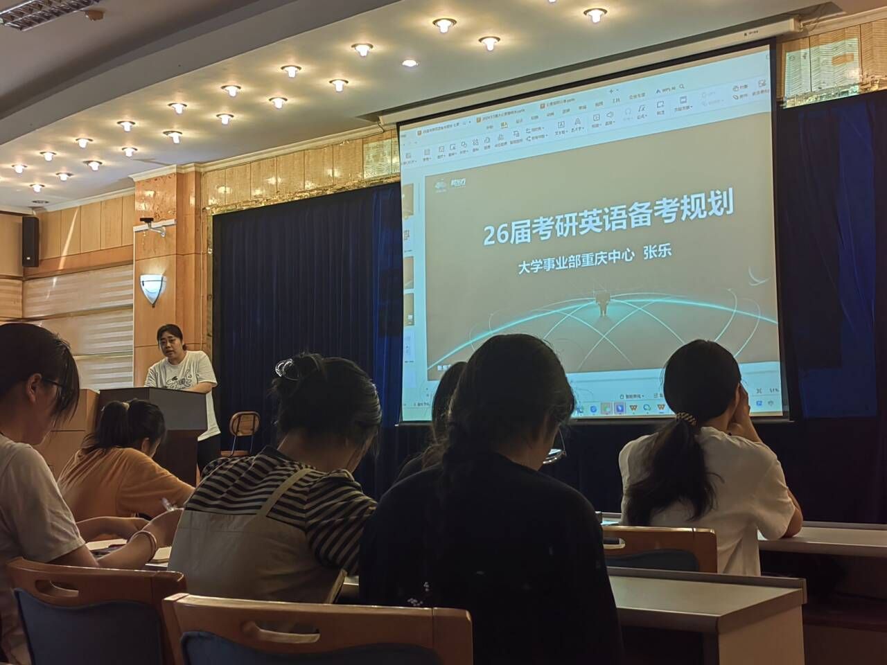 然后,汪老师在结束了自己的部分后,将讲台交给了负责考研英语备考规划的张乐老师。张老师直击痛点,指出考研英语的重要性和关键性,并从单词、语法、句型三个方面解析了考研英语,最后给出了同学们一个完整的考研英语全程复习规划时间线的建议。