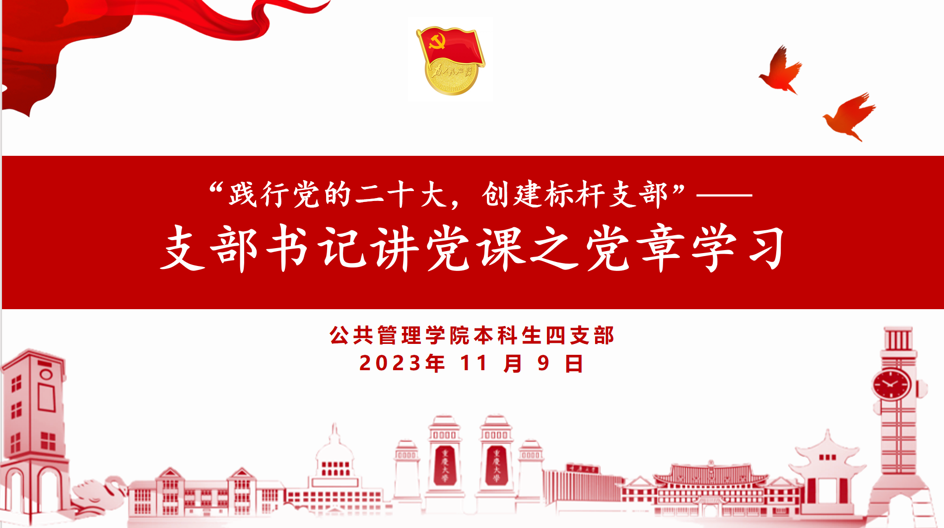 2023年11月9日16:30,“支部书记讲党课之党章学习”主题教育专题党课在学院楼106教室圆满落幕。此次专题党课,主题鲜明,内容丰富,通过此次学习,大家表示:要不断提高自身政治理论水平,提高党性觉悟,进一步树立自身的党章意识、党员意识、党规党纪意识,争做学习党章党规党纪的模范。