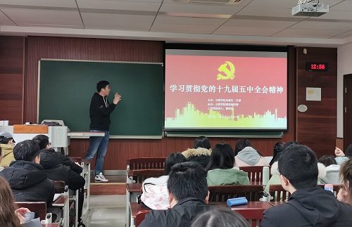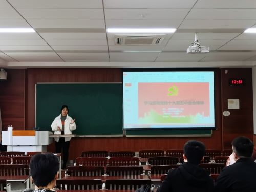 本科生一支部谢的镇江、李阳阳、彭雨馨、胡文烨、郭姝含、严雪颖担任各分会场的宣讲人,分别于D1342、D1343、D1310、D1311、D1312、D1313六个教室向入党积极分子详细介绍了十九届五中全会精神,与会入党积极分子们认真聆听,参与互动,加深对精神的理解和把握。