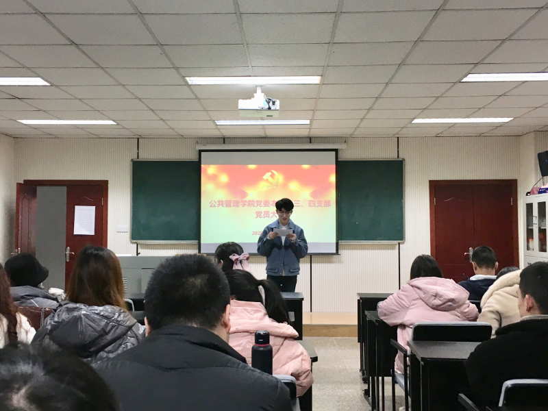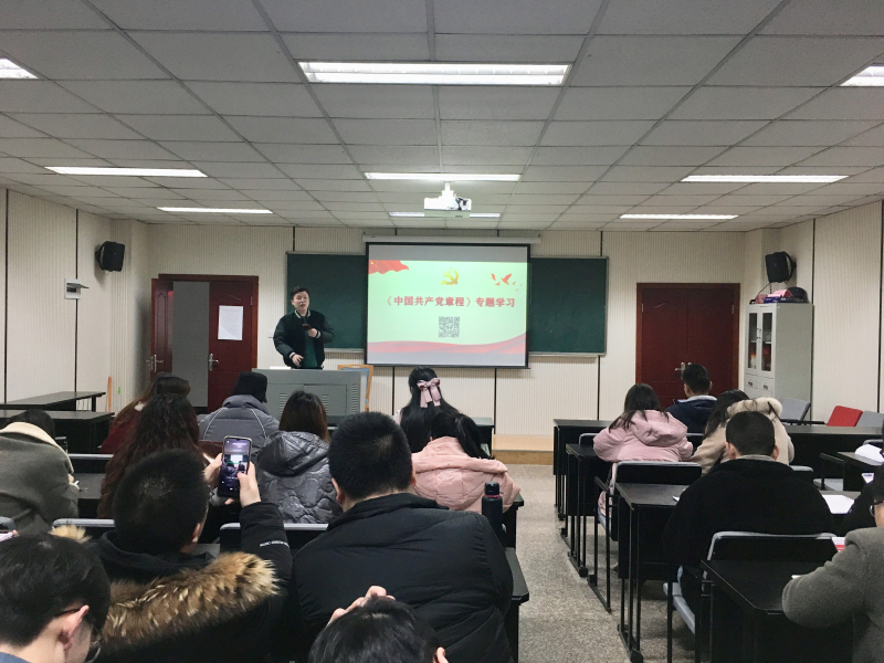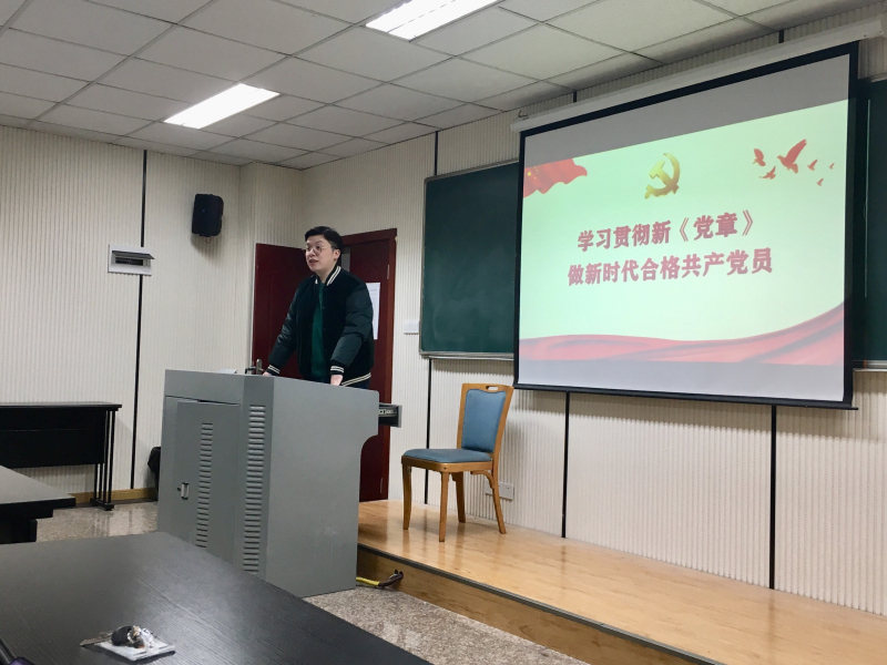 党委本科生三、四支部在学院104教室召开党员大会,集体学习《党章》。2017级本科生辅导员、三支部书记包晗主持会议并以“学习贯彻新《党章》,做新时代合格共产党员”为题讲党课,三、四支部全体党员参加会议。