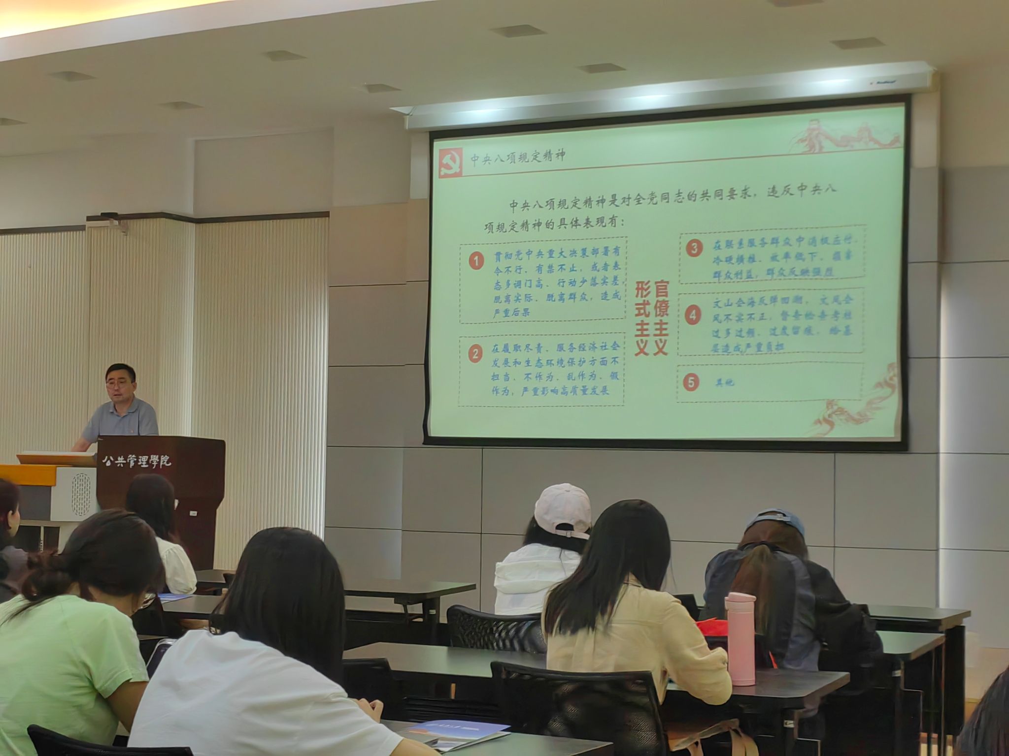 汪涛教授从深入贯彻中央八项规定精神学习教育的重要意义、目标要求、精神内容、相关制度规定和违反中央八项规定精神典型案例五个维度展开系统讲解,并结合亲身经历,严肃指出:“从中央到基层,我们党对‘踩红线’、闯‘雷区’的作风问题始终坚持零容忍态度。”他强调,八项规定是全面从严治党的“金色名片”,是密切党同群众血肉联系的“关键纽带”,更是学院营造风清气正育人环境、推动高质量发展的“生命线”。我们党就是在不断剖析自我、革新自我和净化自我的过程中取得成功。