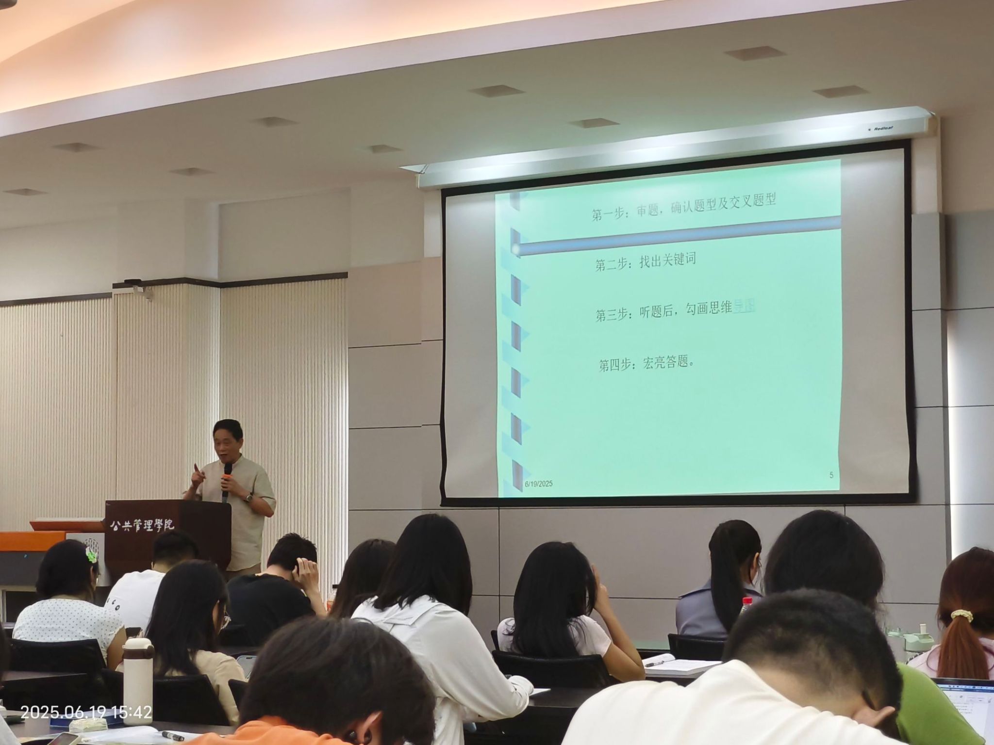 拥有近四十年党校教学经历、长年担任国考省考命题人与主考官的袁玉鸣,以“申论是公共治理思维的文字化呈现”为切入点,结合湖北、重庆等地命题实战经验,揭示出题者“政策理解—问题分析—方案实操”的三维考核逻辑。他指出,近年申论命题正从“材料归纳”向“场景化治理”转型,如2024年重庆卷“老旧小区改造中的民意协调”题,本质是考察基层治理中政策落地与民生需求的平衡能力。针对考生“套路化答题”痛点,他提炼“审题三要素法”——精准抓取题干中“行为主体、核心任务、特殊要求”,以区政府工作人员撰写动员讲话稿为例,现场演示如何定位政府立场、匹配动员场景、规范公文格式,构建“政策依据—问题剖析—创新方案”的黄金答题框架。
