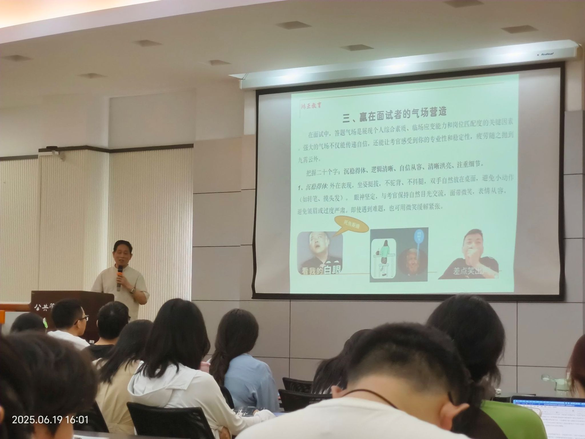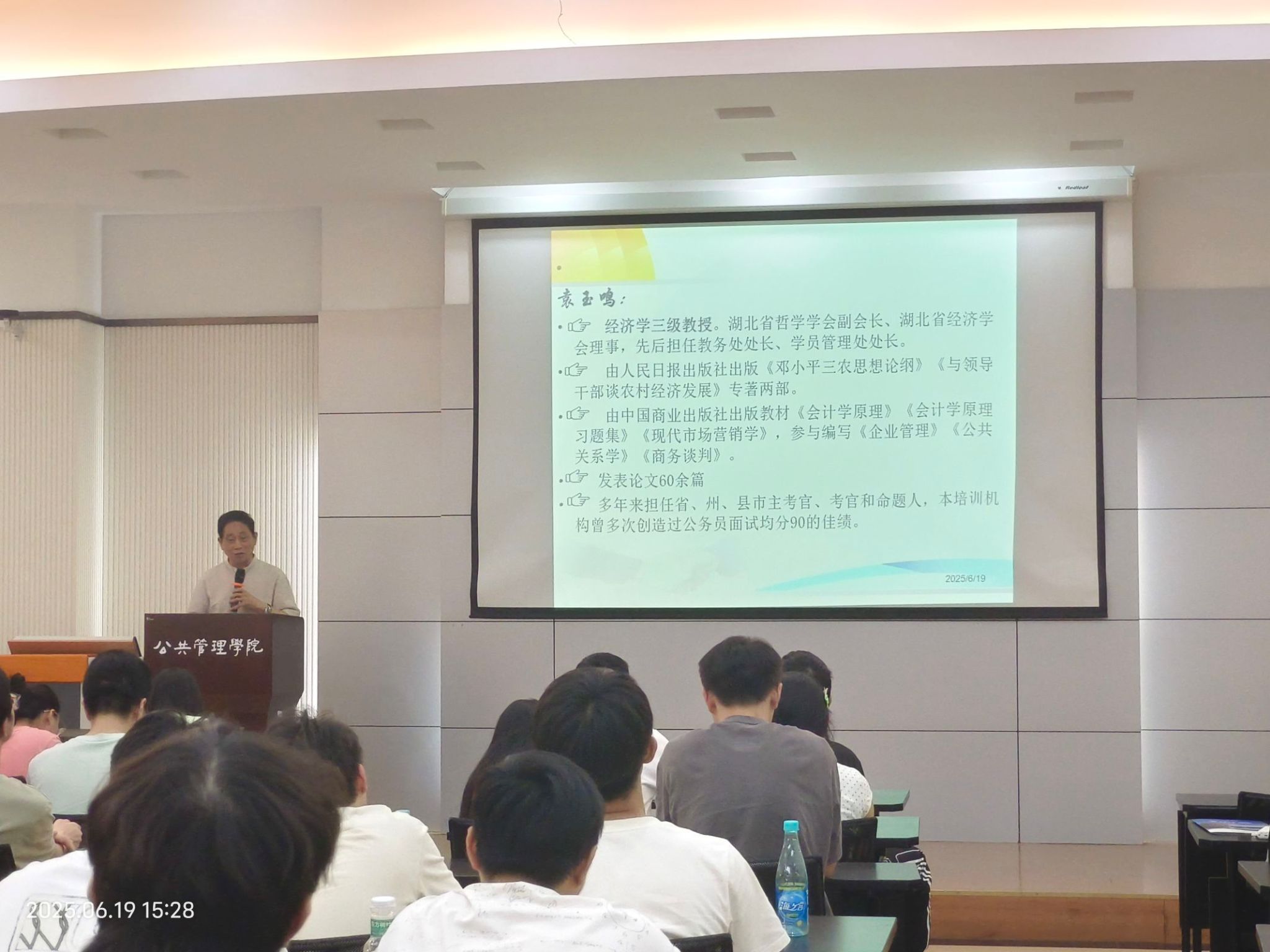 本科生一、四支部开展“样板支部新征程,党建引领办实事”系列活动。特邀经济学三级教授、湖北省哲学学会副会长袁玉鸣于学院楼102报告厅开展“炼成申论高分,赢在公考面试”专题培训。这场党建服务活动聚焦考公核心能力的提升,学院本科生一、四支部全体党员、预备党员、入党积极分子及有考公意向的166名同学都积极到现场参与。