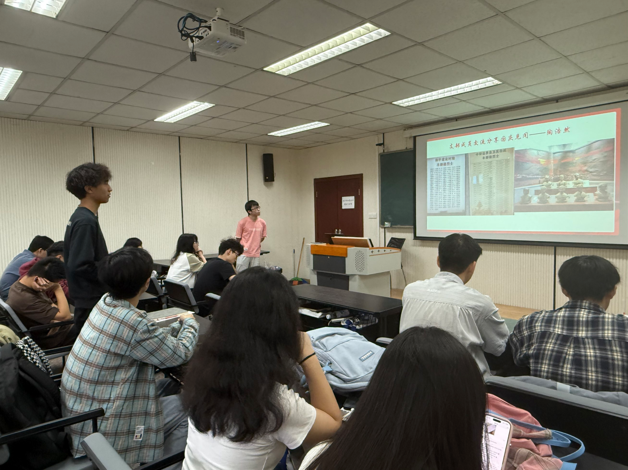 理论学习结束后,活动进入交流讨论阶段,支部成员们以国庆期间拍摄的相关照片为线索,分享个人学习心得和感悟。陶浩然同志分享了参观丰都革命烈士纪念馆的经历,他号召青年党员要继承和发扬革命先烈的优良传统,让抗战精神在新时代焕发出新的活力。张锴文同志讲述了自己走进重庆人民大礼堂,从革命党员的英雄事迹中追溯红色记忆,体悟红色文化,深刻感受到了革命先辈的奋斗足迹。不同的故事,内核相通,这份共通的爱国情怀与责任意识,让支部成员的思想共识在交流中愈发紧密。