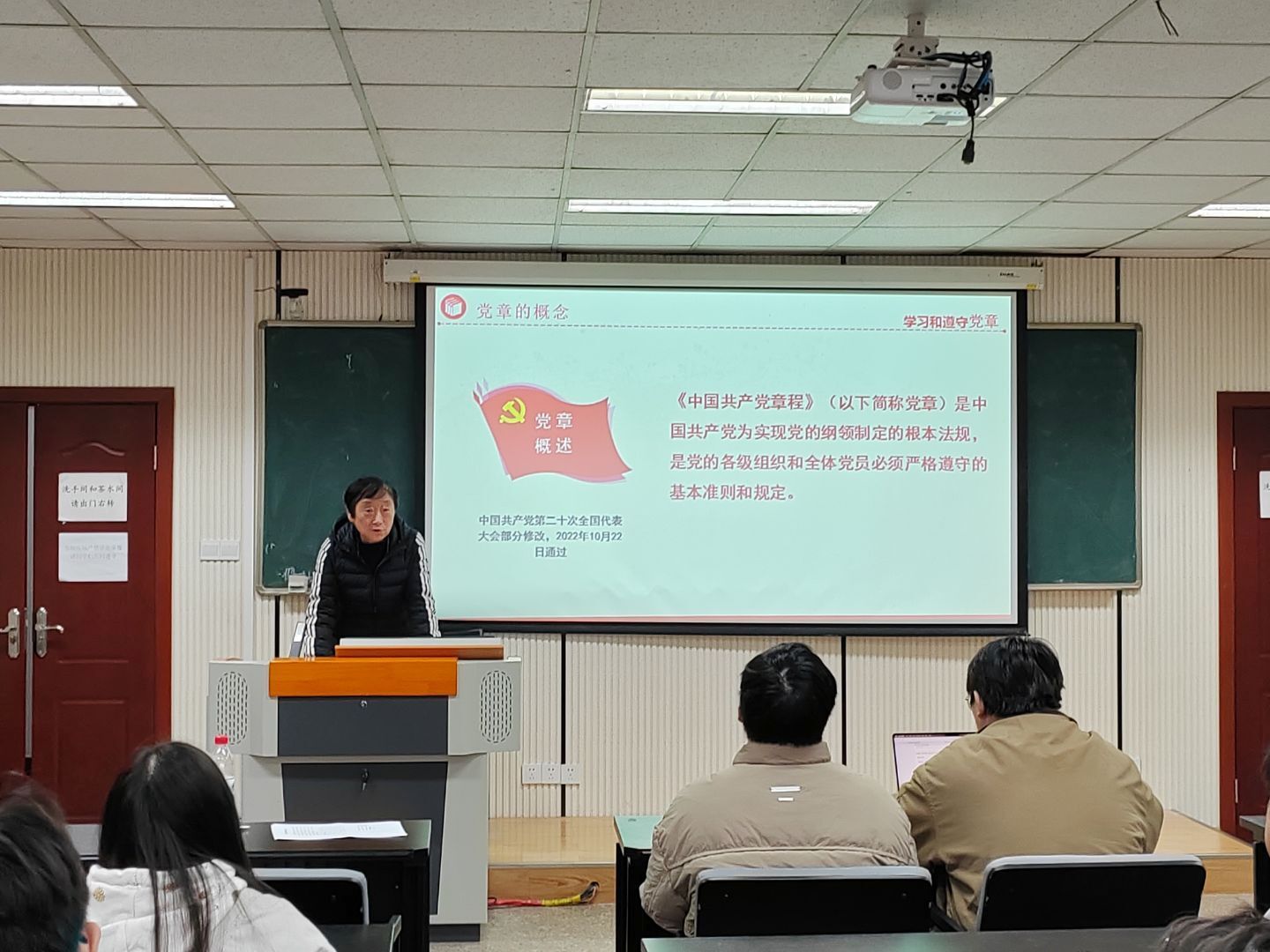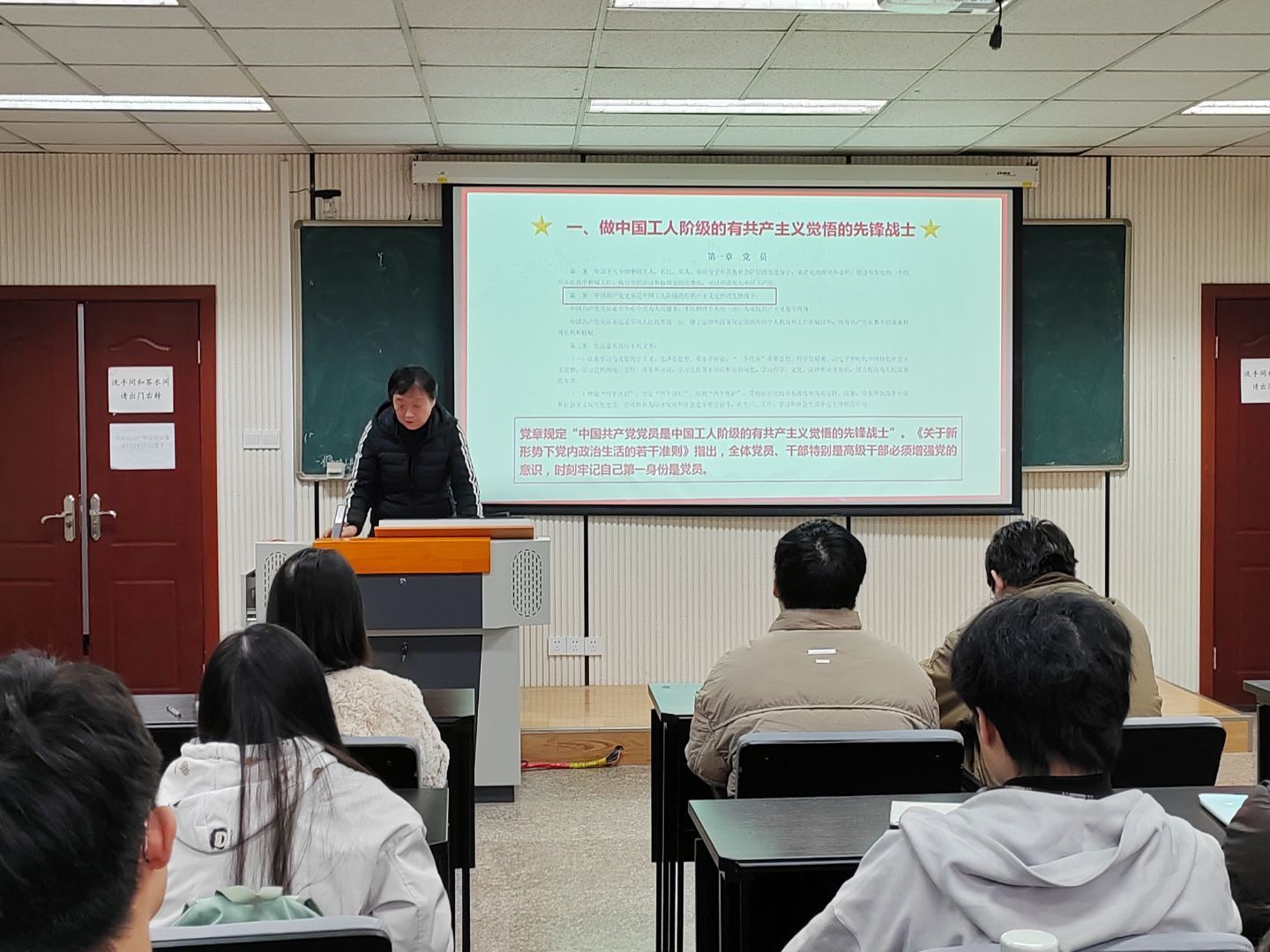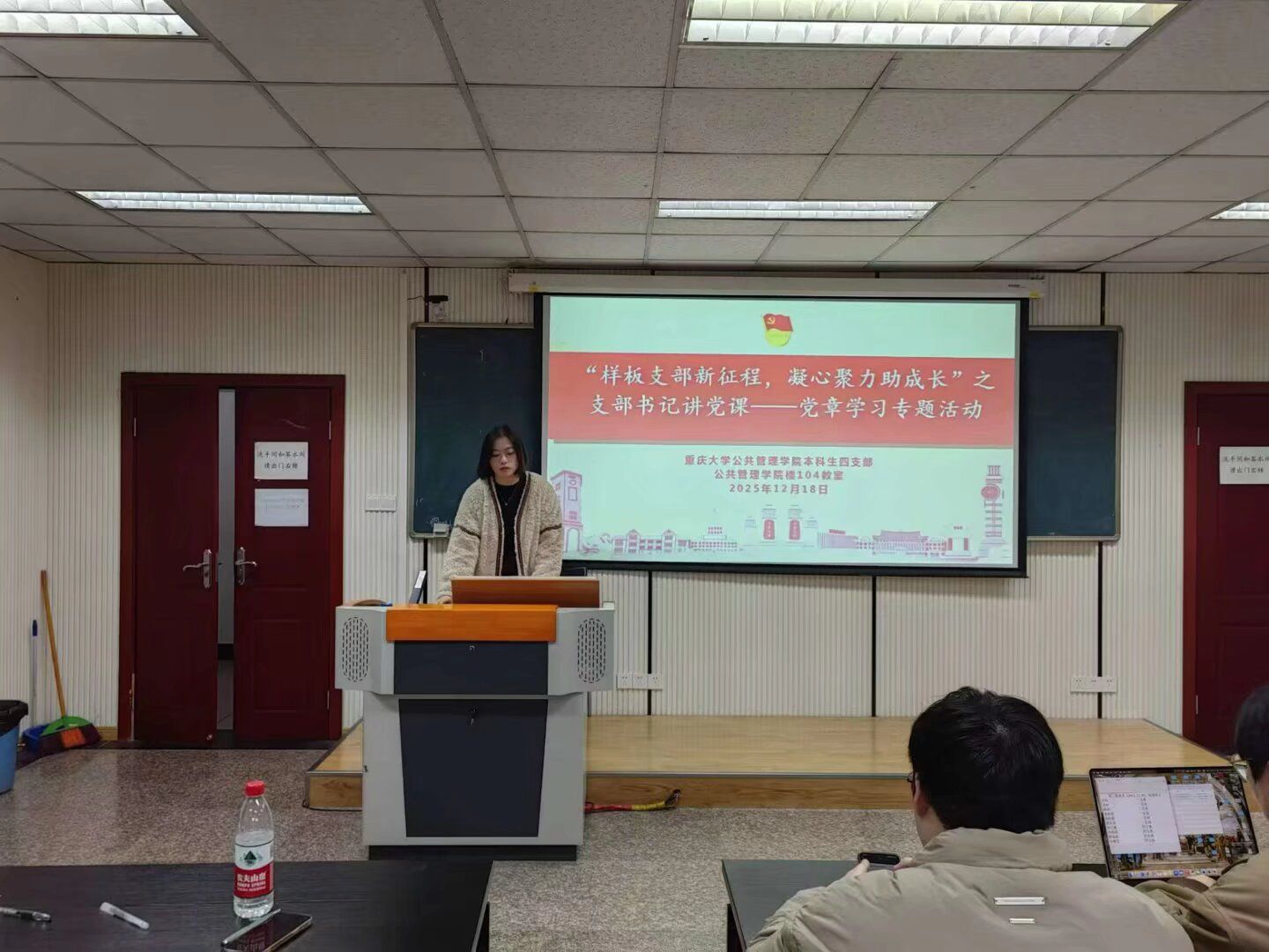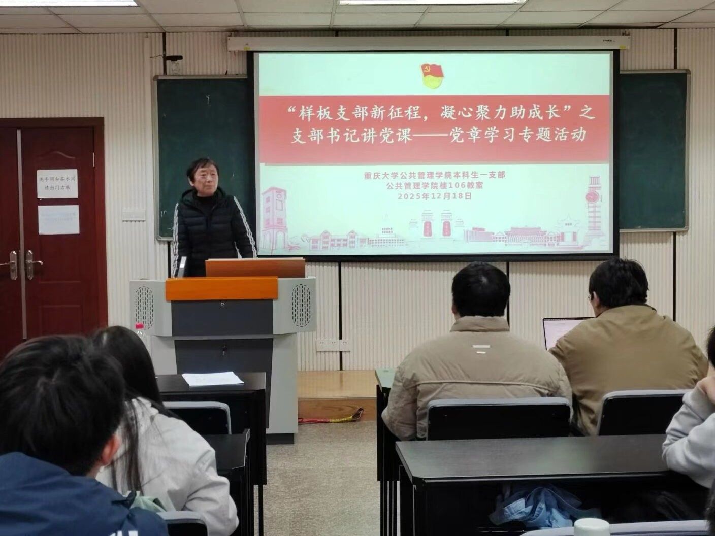 2025年12月18日14:00,学院本科生一、四支部于学院楼106教室成功举行“样板支部新征程,凝心聚力助成长”系列活动之支部书记讲党课之党章学习活动。此次活动紧扣《高校党建重点工作任务(2025—2027年)》部署要求,响应“巩固深化党纪学习教育成果”的中央号召,由本科生一支部书记王丽娟与四支部书记钱诗佳主讲,本科生一、四支部全体党员积极参与。