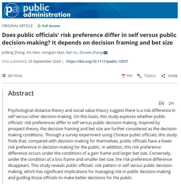 张金凤副教授作为第一作者的文章《Does public officials' risk preference differ in self versus public decision-making? It depends on decision framing and bet size》在公共管理学科高水平期刊Public Administration在线发表。Public Administration是当今历史最悠久的国际公共管理学杂志之一,JCR影响因子在政治学和公共管理期刊中长期名列前茅。该论文是由张金凤及其指导的硕士研究生温馨(论文第二作者,韩国h漫