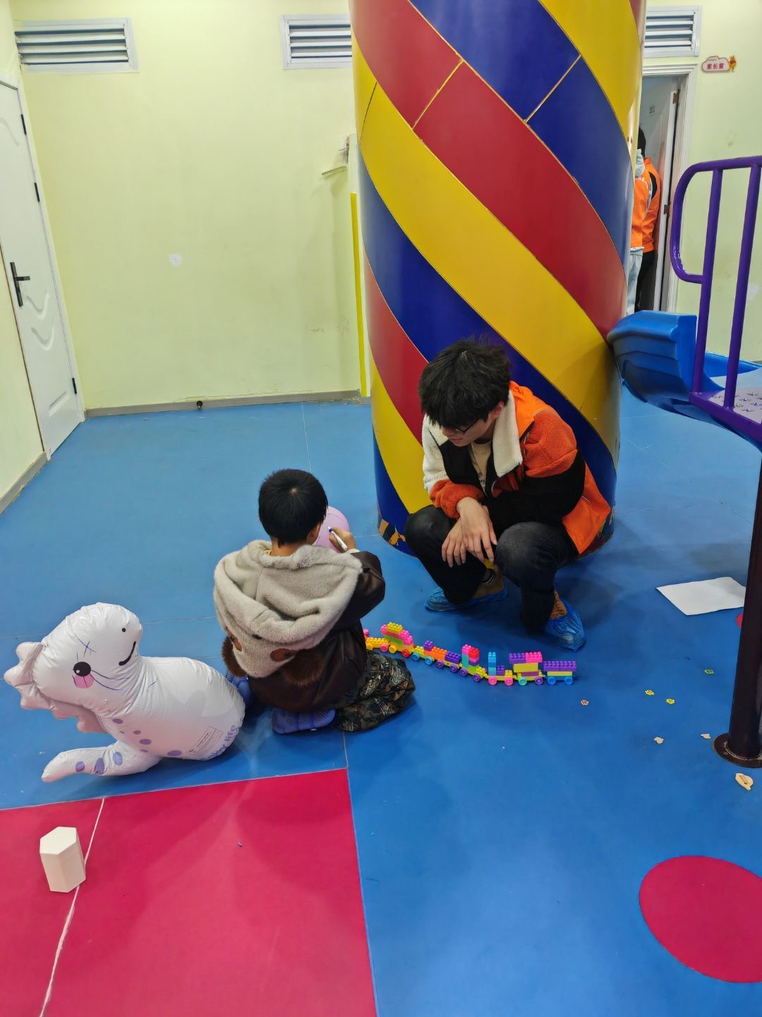 活动过程中,我们实行“两名志愿者对应一位小朋友”的配对模式,让每个孩子都能拥有专属的陪伴与照料。小朋友们的兴趣偏好各不相同:有的拿起画笔,将脑海里的奇思妙想化作笔下的斑斓画面;有的沉浸在积木搭建的乐趣中,拼搭出造型各异的作品,志愿者在旁时刻细心看护;还有的热衷于大堂的游乐设施,志愿者便始终耐心紧随其后,全力筑牢孩子们的安全防线。