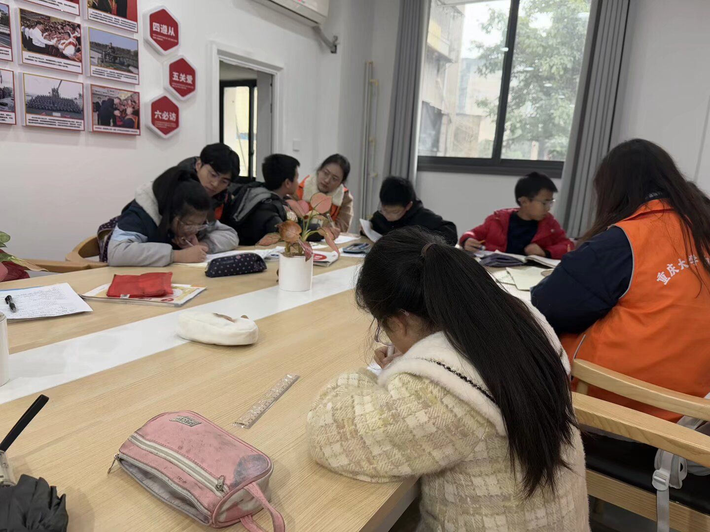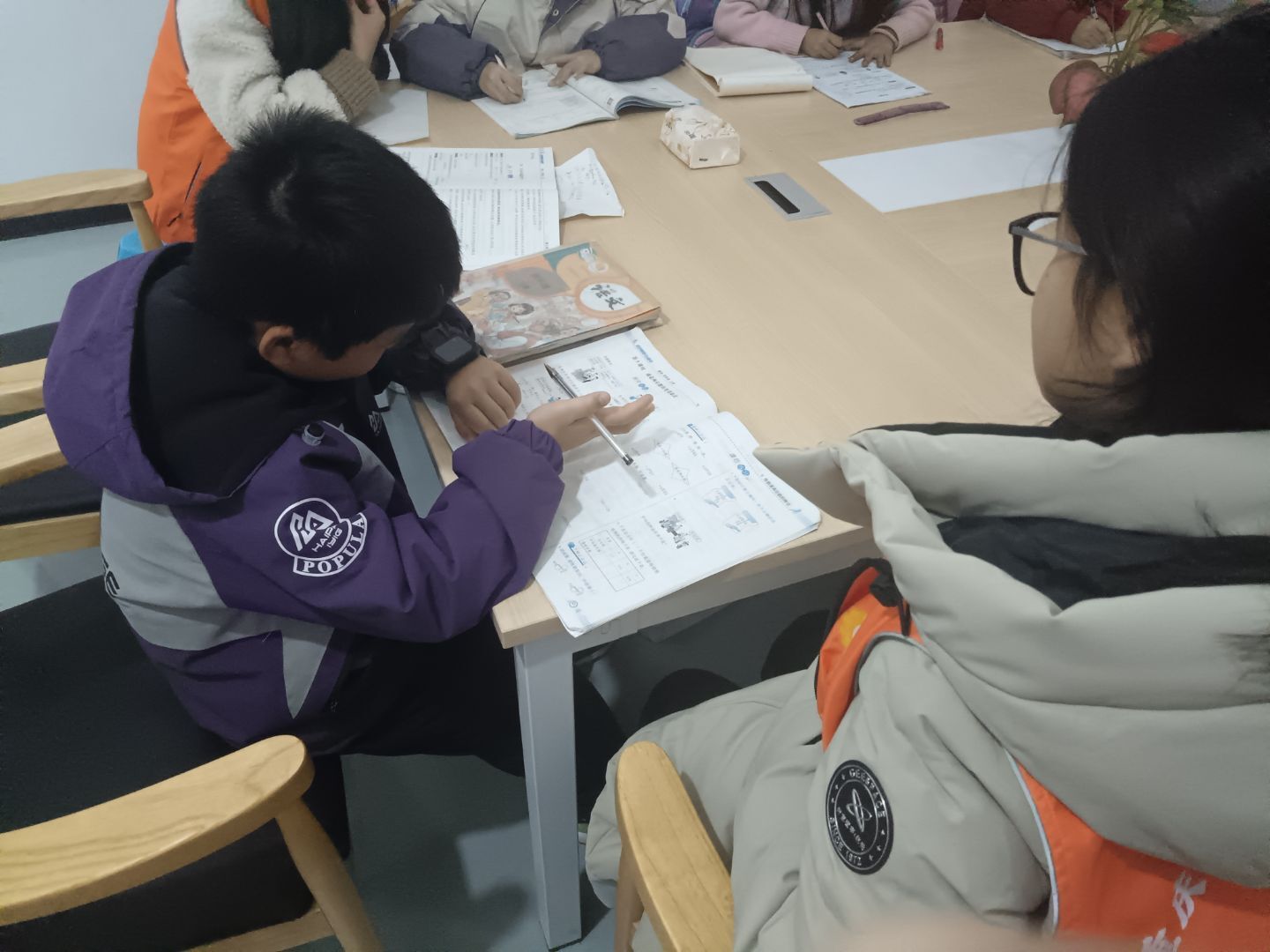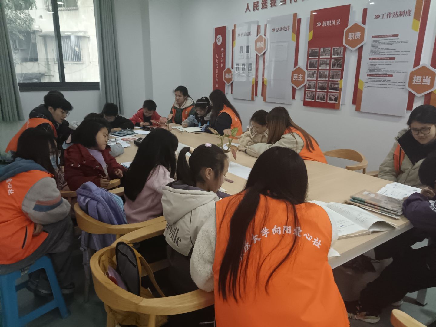 活动现场,身着橙色社服的志愿者们成为了冬日里一抹温暖的亮色。他们围坐在长桌旁,耐心地解答孩子们提出的每一个疑问。从照片中可以看到,志愿者们时而俯身仔细查看孩子们的解题步骤,时而轻声细语地点拨思路上的误区,力争让每一个孩子都能把难题“听得懂、吃得透”。