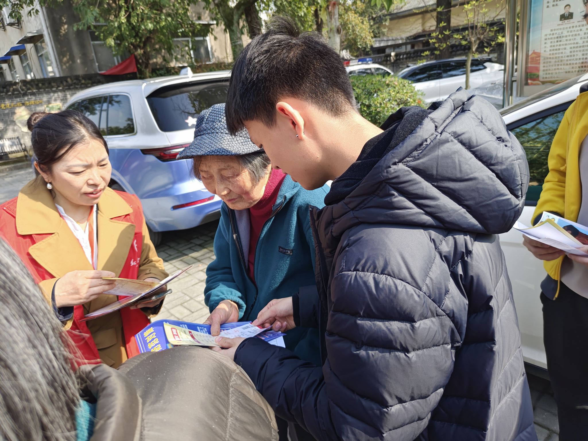 培训结束后,志愿者们与社区工作人员、民警兵分多路,同步开展入户宣传和室外宣传。入户宣传时,志愿者们跟着社区工作人员,逐户敲响居民家门。他们结合民警培训内容,耐心地为居民讲解常见诈骗手段;社区民警则结合实际案例,生动地传授防诈技巧和应对方法。同时,志愿者们邀请居民填写社区服务民意调查问卷,认真记录居民的意见、建议和每一个诉求。