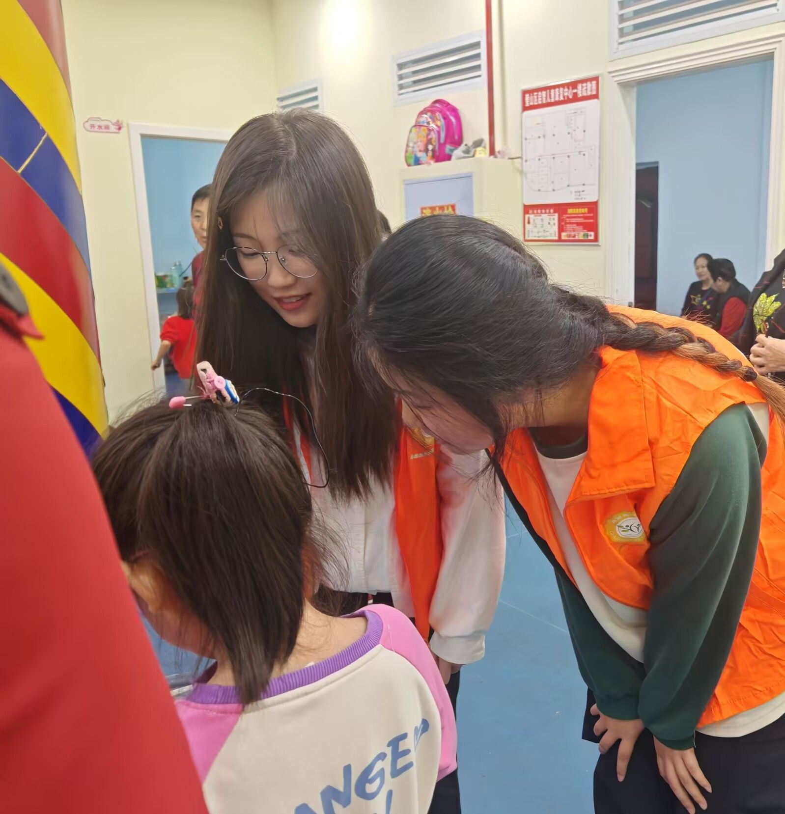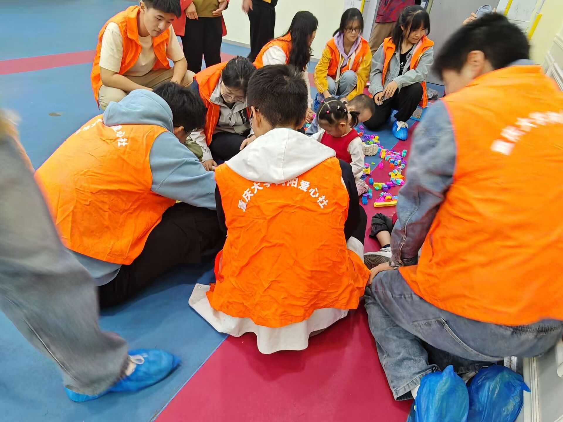 整个过程中也有一些有趣的事情。看到有的小朋友玩累了,志愿者就像对待自己的弟弟妹妹一样,耐心地背着他们,让小朋友靠在背上好好休息。