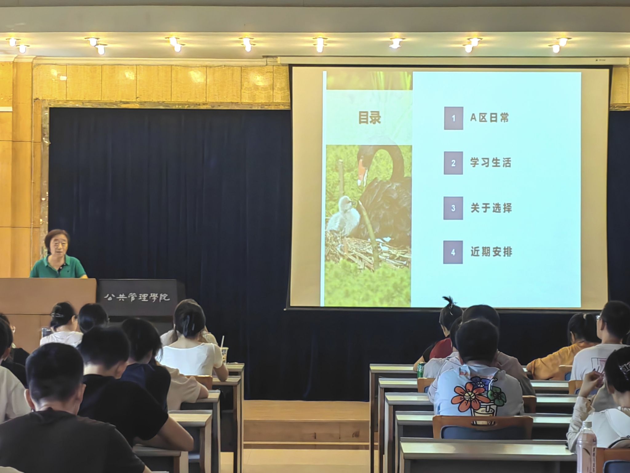 大会首先聚焦于A区学生的日常生活管理。王老师向同学们再次详细介绍了学院教务、党委等办公室的日常事务、办公时间、联系方式和单位地址,以方便同学们解决教务、行政方面的问题。
