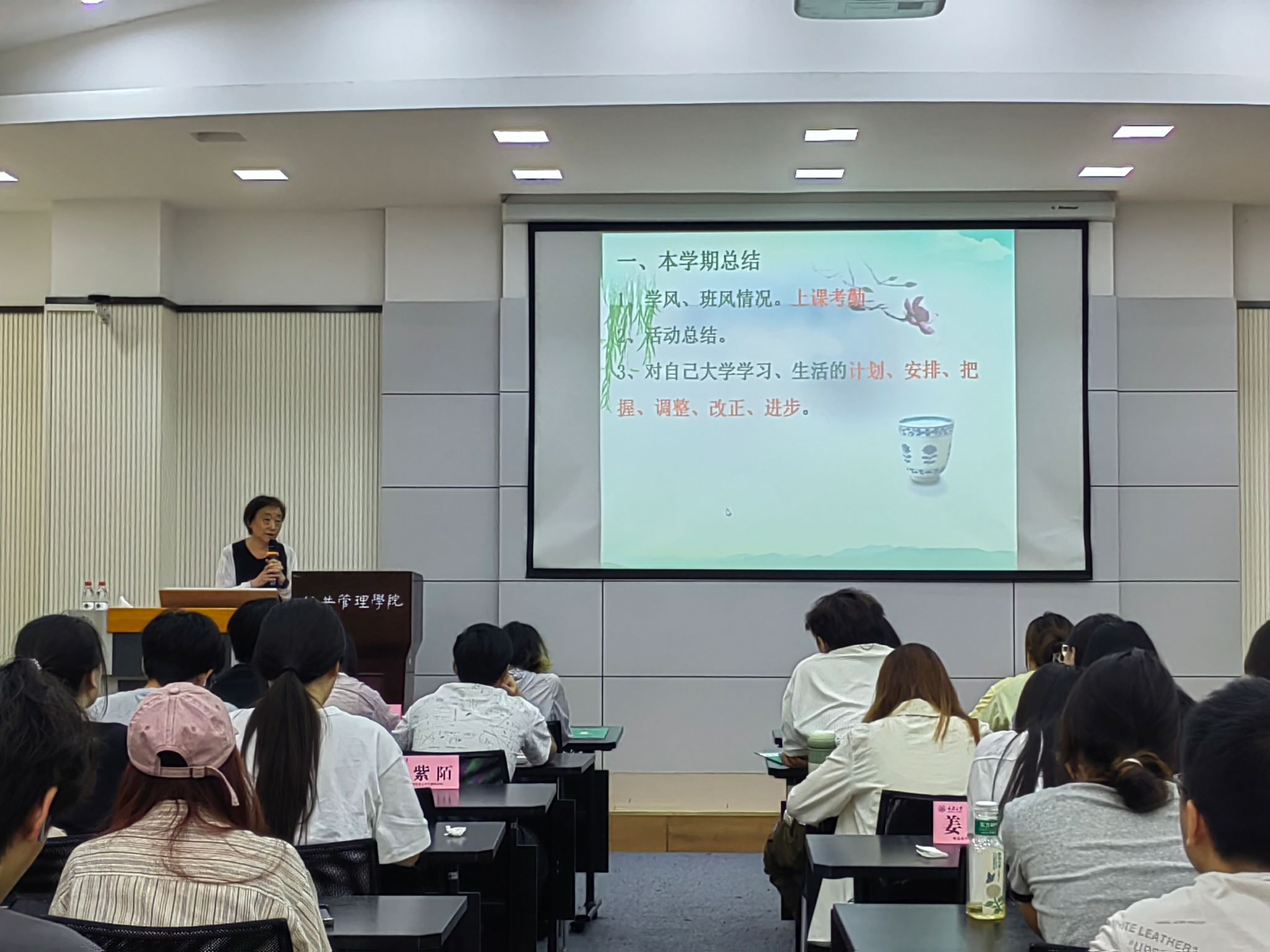 会议的第四部分为下学期注意事项。王老师为下学期提出了几个建议性的要求来帮助大家更好的兼顾学习和生活,比如,1.凡事依靠自己的习惯,不要过于依靠自己的父母;2.关注一切都对自己有用的消息;3.遇事除了自己,多想想别人的习惯;4.为自己的行为负责等。王老师还表示,岁月如梭,下学期同学们就成为了大三学子,不仅要努力学习,取得优异的学业,也要对自己的未来发展和工作进行准备和规划,是选择继续升学还是就业,是准备出国学习还是考公务员,这都需要进行分析思考和着手准备规划,因为时间不等人,同学们必须不断向前迈进。