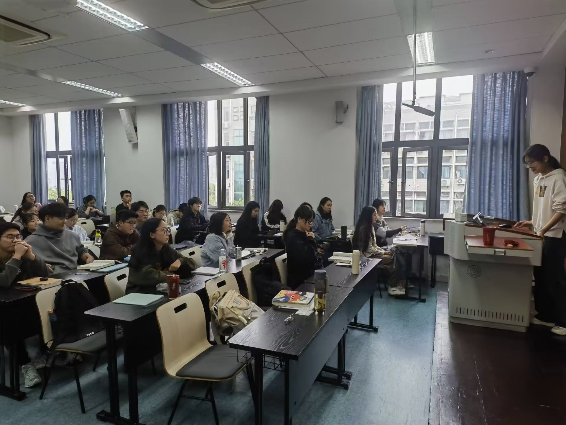 活动伊始,班级团支书姜熠首先向同学们详细讲解了中央外事工作会议内容。通过对我国外交领域的指导思想和实践成果的讲解,同学们对党的最新理论成果有了更加清晰的认识,更加坚定了跟党走的决心和信心。然后,团支书也为同学们讲解了中央外事工作会议的内容,她强调会议的主要内容是对于习近平外交思想的深刻理解和把握。鼓励同学们自学自学《中共中央关于进一步全面深化改革、推进中国式现代化的决定》。在讲解过程中,同学们认真倾听,专心学习,积极互动,踊跃发言,现场氛围浓厚。