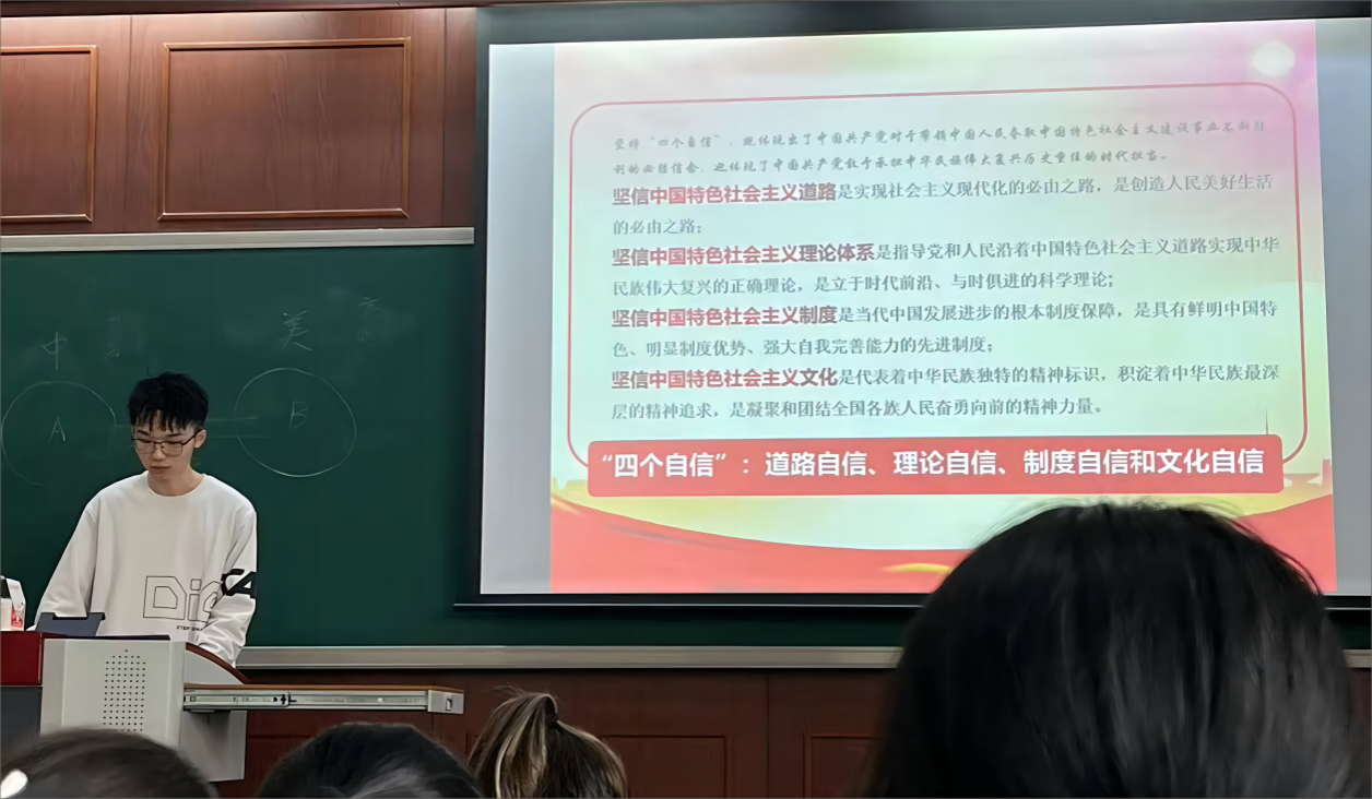 该支部精心准备、制作PPT,先组织同学在教室里学习党的理论知识,全面深入了解“坚强核心”内涵、领悟“两个确立”、增强“四个意识”、坚定“四个自信”、做到“两个维护”。学习中分各专题选代表发言交流、分享心得体会。黄丹怡、刘星雨、黄浩哲、唐纡康等同学发言表示,当代大学生减肩负推进中国式现代化的历史使命,要深刻领悟“两个确立”,坚决做到“两个维护”,这是实现伟大“中国梦”的坚强保障。我们要在思想上铸魂,并见行见效,体现重大学子的赤子之心与为民情怀。