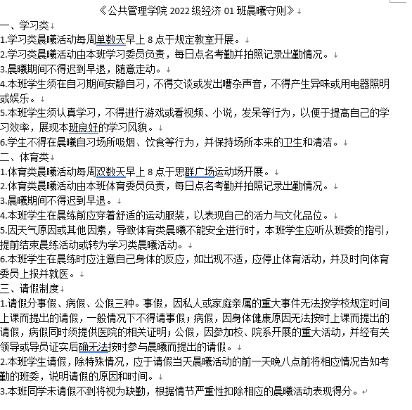在学校、学院和年级的号召下,2022级经济1班为顺利开展“晨曦计划”制定出了相应的守则,在试行两周后明显看出该守则的制定提高了同学们参与晨曦活动的热情,也为进一步帮助同学们养成良好的作息习惯和提升身体素质做出了充分的准备。