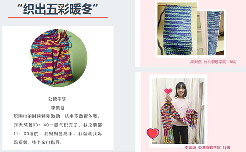五彩石服务队志愿者们还积极参加了由五彩石志愿者协会组织的“爱要大声说出来”视频征集活动、五彩石志愿者分享会、“织出五彩暖冬”、“以爱之名,以礼送暖”、留影五彩作文等一系列活动,涌现出一大批热爱志愿服务、乐于奉献的榜样志愿者。他们不仅为远方的留守儿童带去了温暖,还给志愿者们带去了有意义的心灵体验,通过自己的努力帮助他人,彰显了新一代公管人的热情与志愿服务精神。