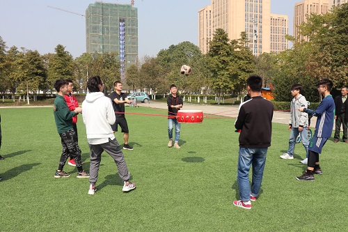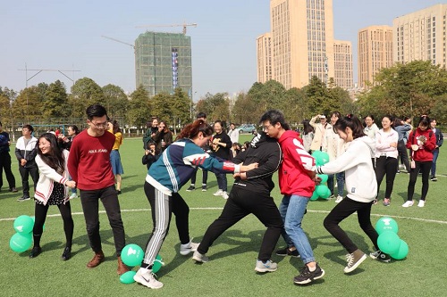 其中最激动人心的莫过于踩气球游戏,“狭路相逢,勇者胜”。踩气球游戏中,每班一男一女相互配合,女生脚上系上三个气球,拉住男生胳膊,男生保护女生并找机会踩爆其他队伍的气球,最后剩下气球多者胜出。男生们身姿矫健,使劲浑身解数保护气球,同时,还要向其它队伍发起攻击。女生们也毫不示弱,像鱼儿一样灵活地穿梭着,观察场上局势的变化。场外观战的同学们也看得十分激动,焦急又兴奋。